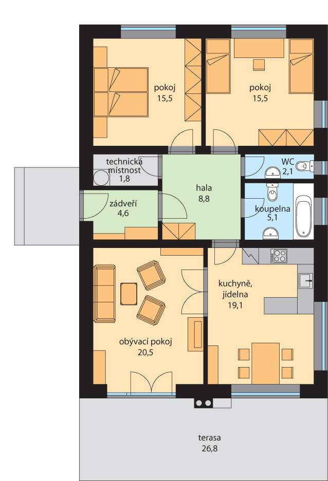 Rodinný dům Mariánka je přízemní dům moderního vzhledu dispozičně řešený pro bydlení 4 osob. Ze zádveří se dostanete do prostorné haly, odkud máte přístup do všech místností domu-samostatné kuchyně s jídelnou, obývacího pokoje, pokoje, ložnice, koupelny, WC a technické místnosti, která může sloužit jako komora. Moderní obývací pokoj je opatřen krbovými kamny a jsou zde navrženy balkonové dveře vedoucí na terasu. Dům před přehřátím z jižní strany chrání pergola. Tento díky minimu otvorů na sever je možné postavit jako nízkoenergetický.