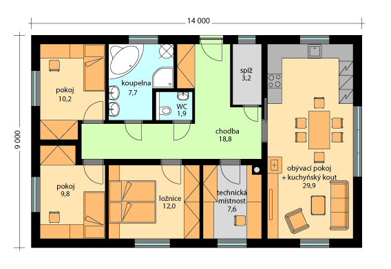 Rodinný dům DÁŠENKA je bungalov menší velikosti, jehož jednoduchá dispozice obdélnikového půdorysu umožní ve 4 obytných místnostech pohodlné bydlení jedné rodině. Vstup do domu je přímo do chodby, ze které je vstup do všech místností - obývacího pokoje s kuchyňským koutem, ložnice, obou pokojů, koupelny. Spíž, šatní skříně a WC se nachází vedle vchodu domu. Technická místnost může sloužit jako šatna, nebo malá pracovna. Francouzská okna v obývacím pokoji umožňují nejen propojení interiéru s exteriérem, ale hlavně dostatečné osvětlení.