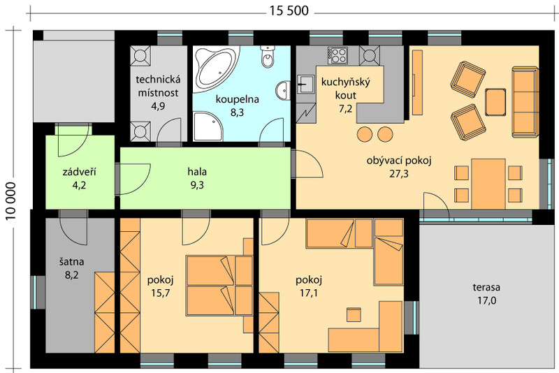 Rodinný dům Věrka je přízemní dům moderního vzhledu dispozičně řešený pro bydlení jedné rodiny. Ze zádveří se dostanete do haly, odkud máte přístup do všech místností domu. Moderní obývací prostor je vybaven kuchyňskou linkou, nechybí jídelní kout a místo pro prostornou sedačku a velkoplošnou TV. Jsou zde navrženy balkonové dveře vedoucí na terasu. V domě jsou dva samostatné pokoje a dostatek úložných prostor, včetně samostatné technické místnosti. Dům je možné postavit jako nízkoenergetický.