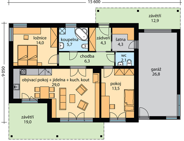 Rodinný dům Viola je přízemní dům s plochou střechou pro bydlení jedné rodiny. Do domu se vstupuje z krytého závětří, zádveřím a dále do chodby, spojující obytné místnosti. Ze zádveří je přes šatnu vstup do garáže. Obytnou část domu tvoří obývací pokoj, propojený s kuchyňským koutem, ložnice a pokoj. Z obývacího pokoje, kuchyně i pokoje je vstup na terasu, kde je pro přirozené stínění a vytvoření pohody navržena pergola.Dům má komín, v obávacím pokoji lze vybudovat krb, nebo instalovat krbová kamna. Součásti domu je garáž, projekt můžeme vypracovat i bez garáže. Dům nabízíme i v dvoupodlažní variantě vhodné pro více člennou rodinu viz. RD Vilibald.