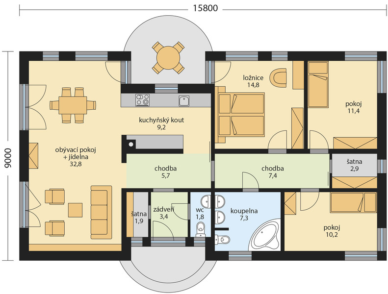Rodinný dům Eunice o velikosti bytové jednotky 4+kk je vhodný pro užívání jedné rodiny. Dispozice zahrnuje prostorný obývací pokoj s jídelnou, propojený s kuchyňským koutem, ložnici, dva pokoje, dvě šatny, WC a koupelnu. Obývací pokoj je opatřen krbovými kamny. Francouzská okna poskytují nejen prosvětlení interiéru, ale umožňují i vstup na terasu. V koupelně je vana, dvě umyvadla, toaleta a místo pro pračku, ev. sprchový kout. Totožnou dispozici v provedení se sedlovou střechou nabízíme u RD Robin.
