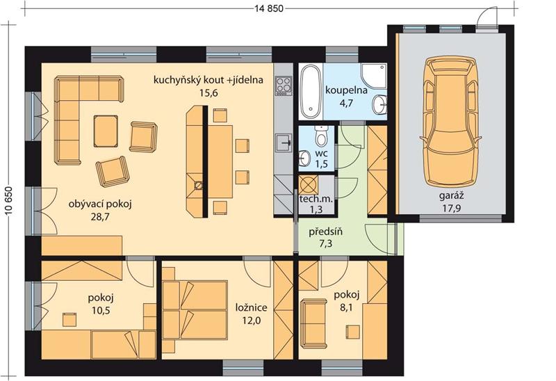 Rodinný dům Deny je bungalov o velikosti 4+kk s garáží, který uspokojí požadavek pro bydlení 3-4 členné rodiny. Jednoduchá dispozice obdélnikového tvaru zahrnuje obývací pokoj s kuchyńským koutem, ložnici a dva pokoje. Obývací pokoj s kuchyňským koutem a jen z pokojů jsou francouzskými okny propojeny se zahradou. Vzhledem k jejich orientaci je nejlepší vstup do domu situovat na sever.