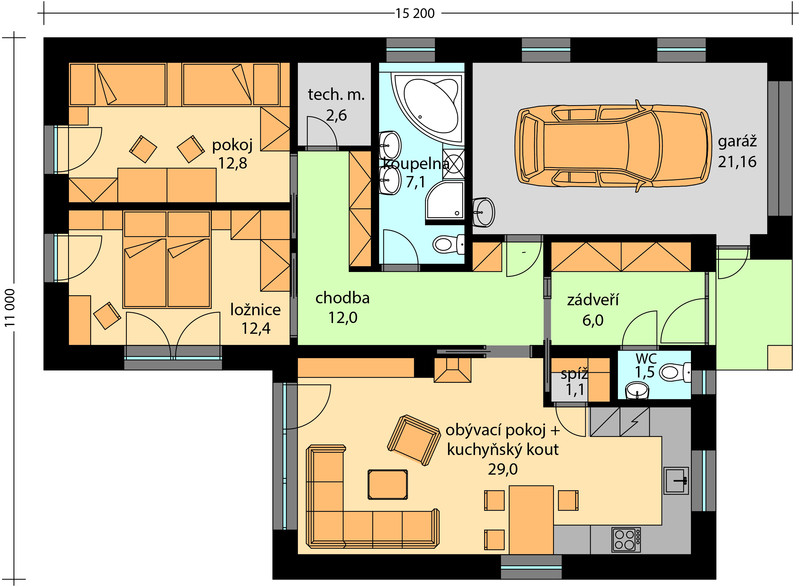 Rodinný dům Babeta je bungalov moderního vzhledu o dispozici 3+kk s garáží, vhodný spíše do městské zástavby. Vstup do domu je zádveřím přímo do chodby, ze které je vstup do všech místností - obývacího pokoje s kuchyňským koutem, ložnice, pokoje, koupelny a technické místnosti. Spíž, šatní skříně a WC se nachází vedle vchodu domu. Technická místnost může sloužit jako komora. Francouzská okna v obývacím pokoji a ložnici umožňují nejen propojení interiéru s exteriérem, ale hlavně dostatečné osvětlení. Fasáda objektu je řešena šlechtěnou omítkou. Odstíny jsou realizovány dle výběru investora.