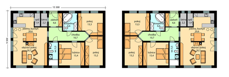 Rodinný dům Guana je bungalov střední velikosti, s valbovou střechou jehož jednoduchá dispozice čtvercového půdorysu umožní ve 4 obytných místnostech pohodlné bydlení vícečlenné rodině. Vstup do domu je zádveřím, za ním následuje chodba, ze které je vstup do všech místností - obývacího pokoje s kuchyňským koutem, ložnice, obou pokojů, koupelny, WC. Šatna se nachází vedle zádveří domu. Francouzská okna v obytných místnostech umožňují nejen propojení interiéru s exteriérem, ale hlavně dostatečné osvětlení. Dům s téměř totožnou dispozicí, ale s valbovou střechou najdete pod názvem Angela.