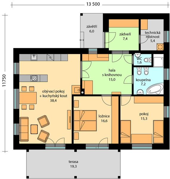 Rodinný dům Kocián je přízemní dům moderního vzhledu dispozičně řešený pro bydlení 4 osob. Dům je navržen tak, aby se v něm všichni členové domácnosti cítili dobře. Ze zádveří se dostanete do krásné a prostorné haly, odkud máte přístup do všech obytných místností domu. Moderně navržený obývací pokoj s kuchyňskou linkou je opatřen krbovými kamny a poskytuje dostatek prostoru pro celou rodinu. V ložnici i v obývacím pokoji jsou navrženy balkonové dveře s východem přímo na zahradní terasu s pergolou chránící před sluncem. Dětský pokoj má okna na dvě světové strany. Koupelna je zařízena jak moderním sprchovým koutem, tak klasickou vanou. Technická místnost s pračkou je oddělena od běžného chodu domácnosti. Při vhodném umístění objektu na pozemek lze využít jako nízkoenergetický či pasivní dům.