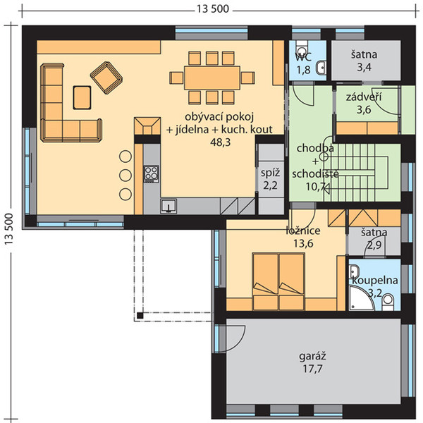 Rodinný dům s garáží NOAH, je modernějšího vzhledu, určený spíše do městské zástavby a umožní bydlení jedné rodině. Vstup do domu je z krytého závětří na východní straně. Půdorys 1.NP je tvaru L s dominantním prostorem obývacího pokoje. Součástí obývacího pokoje je kuchyňský kout s barem a jídelním prostorem. Vstup na terasu (zahradu) je v obývacím pokoji možný prosklenou sestavou s trojkřídlými dveřmi. Ložnice se vstupem do zahrady, má samostatnou koupelnu a šatnu. Hygienické a sociální zázemí zajišťuje samostatná místnost WC. Uspořádání dispozice nabízí i dostatečné množství úložných prostor. V 2.NP jsou dva obytné pokoje s přilehlou koupelnou a komorou, která může sloužit jako šatna, nebo i technická místnost.