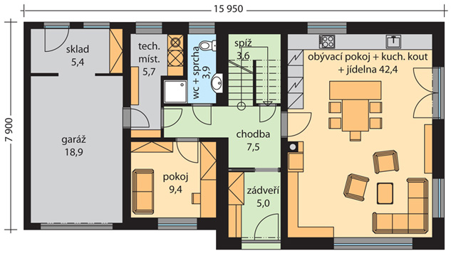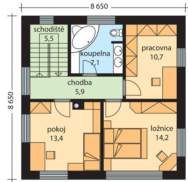 Dvoupodlažní rodinný dům Jiřina moderního vzhledu s pultovou střechou a garáží nabízí pohodlné bydlení i vícečlenné rodině. Větší část přízemí domu tvoří obývací pokoj s kuchyňským koutem a jídelnou. Malý pokoj lze využít jako pracovnu, pokoj pro hosty nebo víceúčelovou místnost. Z obývacího pokoje je výstup na terasu. Dům má komín, lze proto v obývacím pokoji postavit krb, nebo instalovat krbová kamna. V 2. NP se nachází dva pokoje, pracovna a koupelna. Dům má poměrně moderní vzhled, přesto se hodí do prakticky jakékoliv zástavby. Technická místnost umožní v dům dovybavit technologiemi i ve variantě nízkoenergetického provedení a přes ní je dům propojený s garáží.
