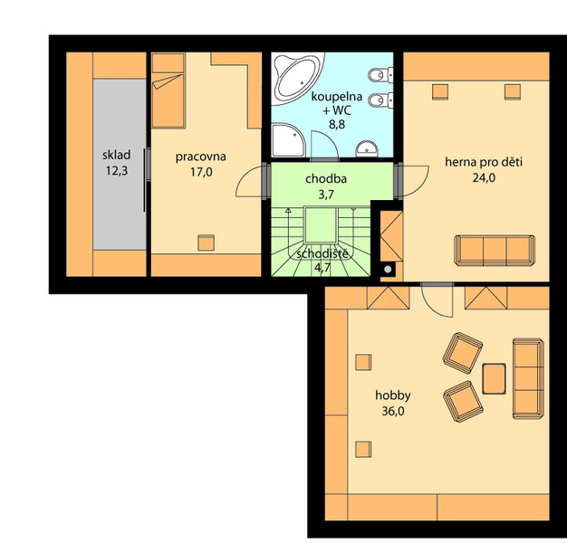 Rodinný dům DIANA s obytným podkrovím, umožní pohodlné bydlení jedné rodině. Obývací pokoj s jídelnou a kuchyň tvoří v přízemí jeden celek, který je propojen francouzským oknem se zahradou. Vstup na venkovní terasu je i z ložnice. V podkroví je pracovna, herna pro děti, hobby místnost a koupelna. Fasáda domu je navržena z obkladových cihliček, ale lze ji řešit i šlechtěnou omítkou. Dispozice je navržena tak, že pokoje mají dostatek úložných prostor, technická místnost umožňuje tento dům vybavit technologiemi i pro mimořádně úsporný standard.