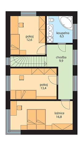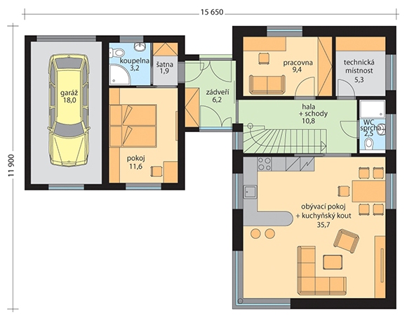Rodinný dům ATILA je moderní dvoupodlažní dům, který tvoří dva na sebe navazující obdélníky propojené zádvěřím. Dispozice umožňuje pohodlné bydlení vícečlenné rodině. Dominantou domu je tradičně obývací pokoj s kuchyňským a jídelním koutem. Na protilehlé straně přízemí se nachází pracovna s přilehlou technickou místností. Z obývacího pokoje se vstupuje na terasu. 2.NP je přístupné schodištěm z haly a nachází se v něm ložnice, dva pokoje a koupelna s toaletou, dvěma umyvadly a vanou. V přistavěné přízemní části se nachází garáž a samostaný pokoj s koupelnou a šatnou, který může sloužit jako pokoj pro hosty, babičku, nebo samostatná pracovna. Z pokoje je přístup na terasu.
