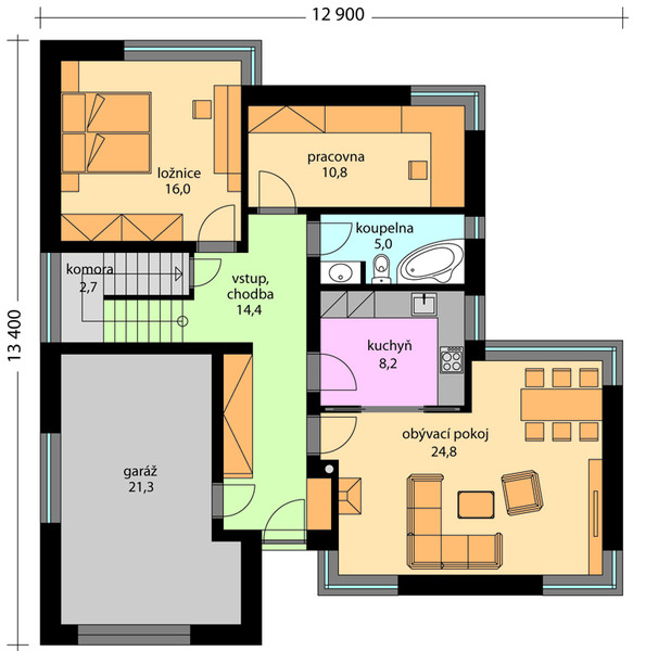 Dvoupodlažní prostorný rodinný dům Aladin moderního vzhledu s pultovou střechou a garáží nabízí pohodlné bydlení jedné rodině. Přízemí domu tvoří obývací pokoj s oddělenou kuchyní s jídelnou. Malý pokoj lze využít jako pracovnu, pokoj pro hosty nebo víceúčelovou místnost, větší pokoj je navržen jako ložnice. Z obývacího pokoje i ložnice je možnost vstupu na zahradu. V 2. NP se nachází dva pokoje a koupelna. Součástí 2.NP je prostorná terasa přístupná z obou pokojů. Dům má moderní vzhled, přesto se hodí do prakticky jakékoliv zástavby.