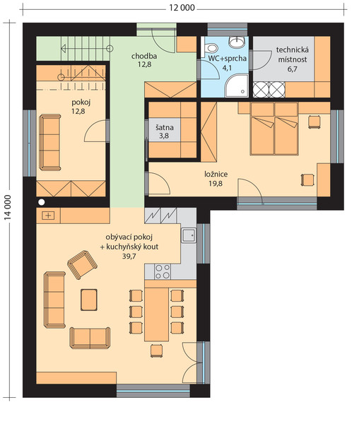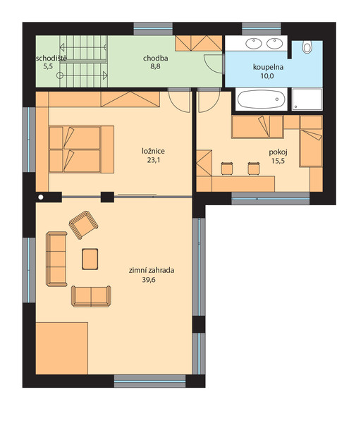 Rodinný dům NIka je modernějšího vzhledu, určený především do městské zástavby, umožňující pohodlné bydlení i vícečlenné rodině. Půdorys je tvaru L s dominantním prostorem obývacího pokoje se zimní zahradou ve 2.patře. Vstup do domu je do chodby, která propojuje všechny místnosti a z ní se schodištěm vstupuje do 2.NP. Součástí obývacího pokoje je kuchyňský kout s jídelním prostorem. Uspořádání dispozice nabízí i dostatečné množství úložných prostor-šatna v přízemí, technická místnost. Vstup na terasu (zahradu) je možný prosklenou fasádní sestavou jak v obývacím pokoji, tak i v ložnici. V přízemí se nachází i pokoj, který se dá použít jako pohodlná pracovna, pro hosty, nebo víceúčelová místnost. V 2.NP je pokoj a ložnice s přilehlou zimní zahradou.