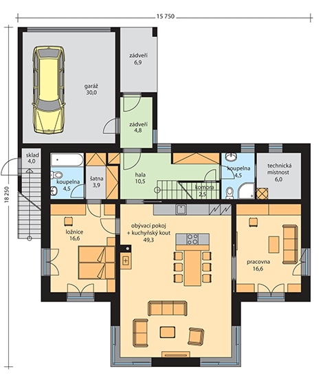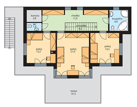 Dvoupodlažní prostorný rodinný dům Naomi moderního vzhledu s plochou střechou, prostornou terasou a garáží nabízí pohodlné bydlení vícečlenné rodině. Přízemí domu tvoří obývací pokoj s kuchyňským koutem sousedící s ložnicí a pokojem, který lze využít jako pracovnu nebo pokoj pro hosty. Ložnice má samostatnou malou koupelnu a šatnu. Z obývacího pokoje, pokoje i ložnice je možnost vstupu na zahradu. V 2. NP se nachází tři pokoje, komora, WC a koupelna. Součástí 2.NP je prostorná terasa přístupná ze všech pokojů se schodištěm do zahrady. Hala v přízemí a chodba v 2.NP nabízí dostatek úložných prostor. Technická místnost umožní dům dovybavit technologiemi i pro nízkoenegetický standard. Dům má moderní vzhled, přesto se hodí do prakticky jakékoliv zástavby.