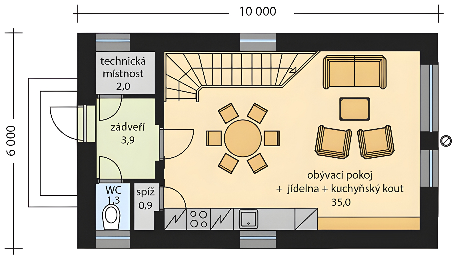 Rodinný dům ALENA je moderní menší dvoupodlažní rodinný dům, kterého dispozice umožňuje pohodlné bydlení jedné rodiny a je vhodný i na užší pozemky. Přes zádveří se vstoupí rovnou do obyvývacího pokoje se schodištěm do 2.NP. Obývací pokoj s kuchyňským koutem je opatřen krbovými kamny. Z kuchyňského koutu je přístupná spíž. Francouzská okna ve všech obytných místnostech umožňují nejen propojení interiéru s exteriérem, ale hlavně dostatečné osvětlení. V 2.NP se nachází klidová část domu-ložnice, dva pokoje a koupelna s vanou, umyvadlem a toaletou.