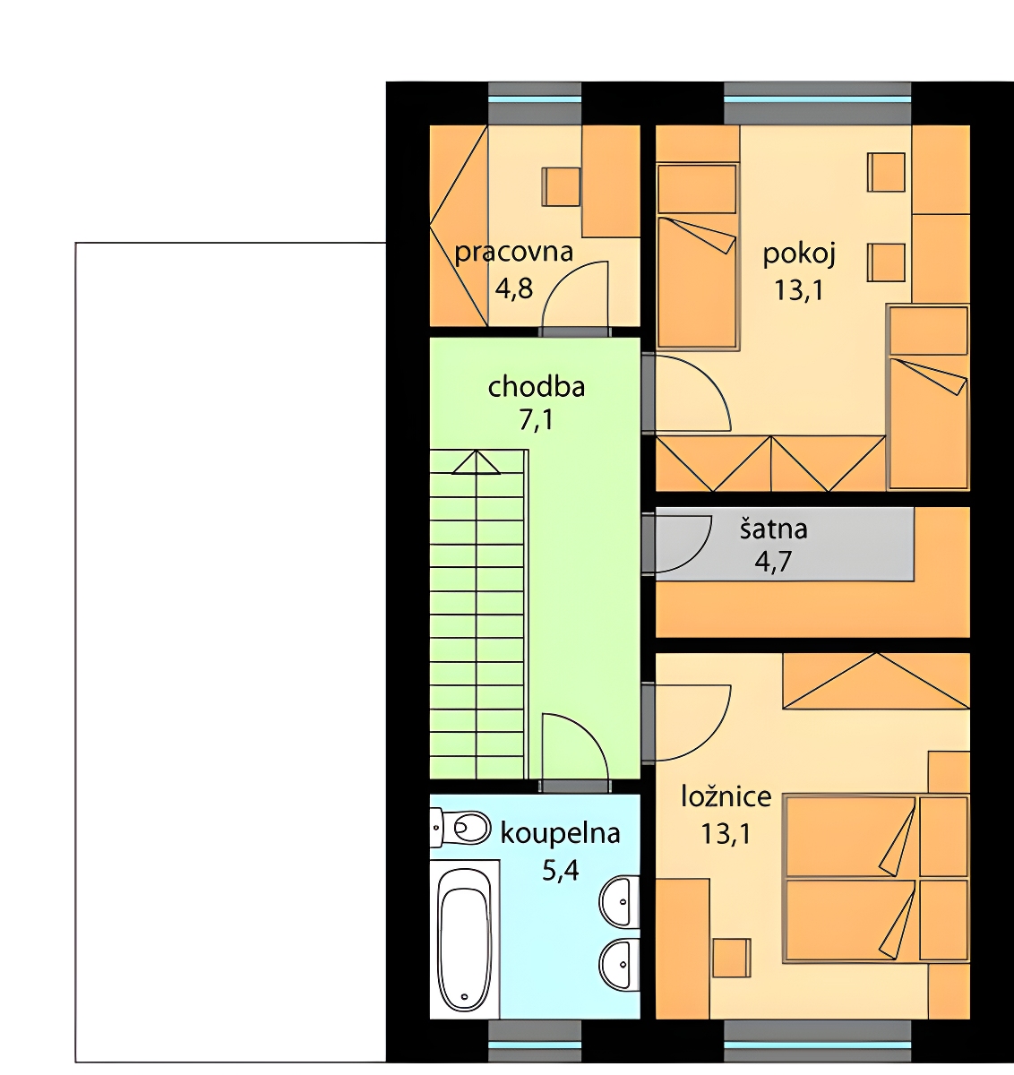 Rodinný dům moderního vzhledu s garáží - DAVID je vhodný pro jednu rodinu. Dispozice a vzhled domu umožňují jej postavit nejen jako samostatně stojící, ale i jako dvojdomek nebo část řadové zástavby. Přízemní tvoří jedna centrální místnost - obývací pokoj s kuchyňským koutem. Klidová část domu je situována do podkroví a tvoří ji ložnice, pokoj a společné hygienické zázemí. Fasáda objektu je tvořena klasickou fasádní omítkou v odstínu dle výběru investora a dřevěným nebo cihelným obkladem. Dům lze postavit i bez garáže, nebo jen s garážovým stáním.