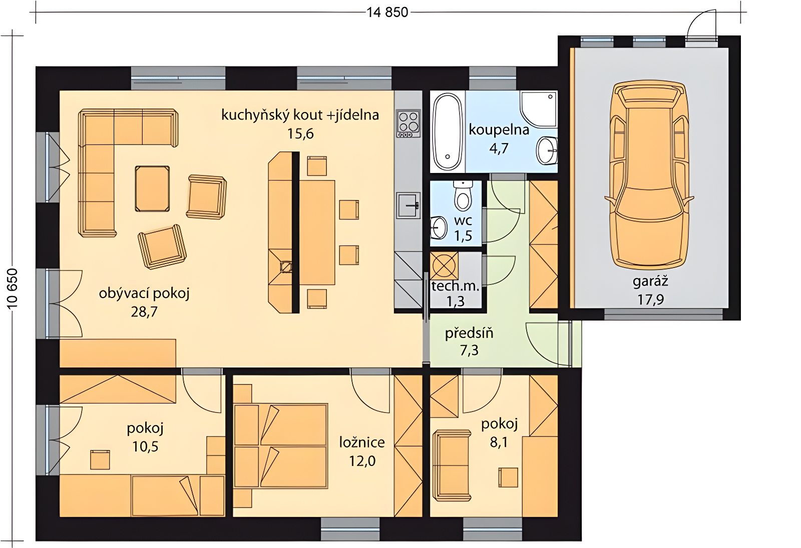 Rodinný dům Deny je bungalov o velikosti 4+kk s garáží, který uspokojí požadavek pro bydlení 3-4 členné rodiny. Jednoduchá dispozice obdélnikového tvaru zahrnuje obývací pokoj s kuchyńským koutem, ložnici a dva pokoje. Obývací pokoj s kuchyňským koutem a jen z pokojů jsou francouzskými okny propojeny se zahradou. Vzhledem k jejich orientaci je nejlepší vstup do domu situovat na sever.