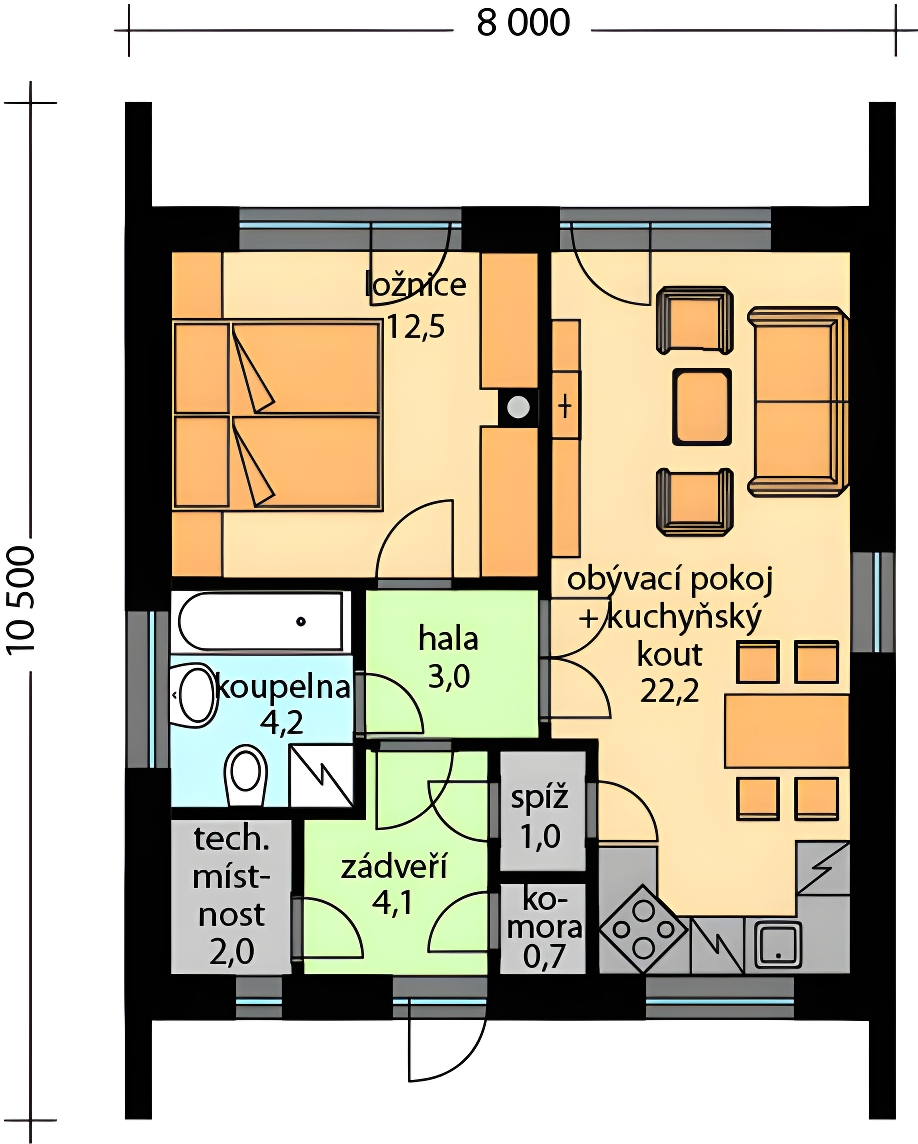 Rodinný dům Dora je dispozičně jednoduchý dům určený pro bydlení jedné rodiny. Velikostí obytné i užitné plochy patří mezi domy menší velikostní kategorie se sedlovou střechou. Vstup do domu je do zádveří, ze kterého se vchází do haly, technické místnosti a komory. Z haly se vstupuje přímo do ložnice, vlevo do koupelny s WC, vpravo do obývacího pokoje s kuchyňským koutem. Francouzská okna v ložnici a obývacím pokoji umožňují nejen vstup z pokojů na terasu, ale hlavně dostatečné osvětlení, proto je vhodné vstup do domu situovat na severní nebo východní stranu. Dům má komín, v obývacím pokoji lze vystavět krb, nebo instalovat krbová kamna.