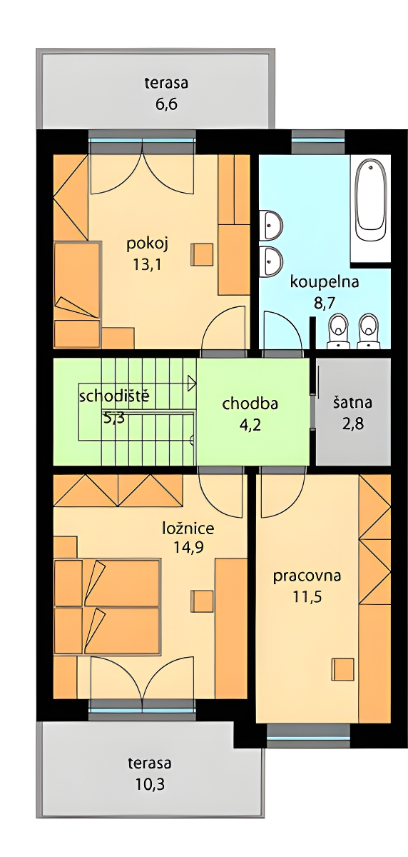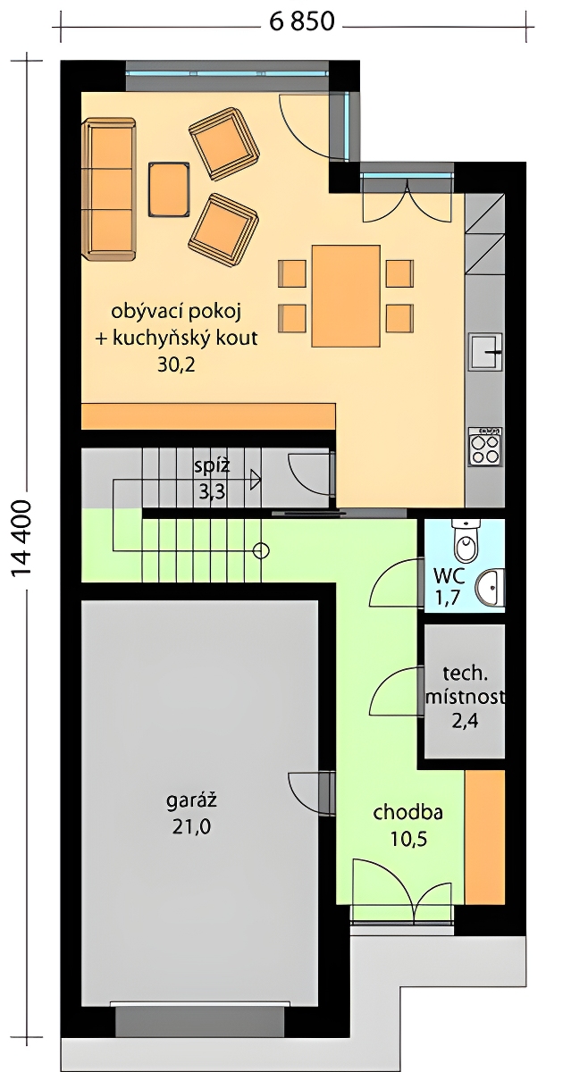 Rodinný dům Eliáš je moderní menší dvoupodlažní rodinný dům, kterého dispozice umožňuje pohodlné bydlení jedné rodiny a je vhodný do řadové zástavby nebo i samostatně stojící na užší pozemky. Ze vstupní chodby se vstoupí rovnou do obytného prostoru, kde schodiště do 2.NP rozděluje dům na dvě poloviny. V přední části domu je garáž, hygienické zázemí s technickou místností, zadní část domu je obytná a tvoří ji obývací pokoj s jídelním a kuchyňským koutem s malou spíží pod schody. Francouzská okna v obou obytných místnostech umožňují nejen propojení interiéru s exteriérem, ale hlavně dostatečné osvětlení. V 2.NP se nachází klidová část domu - ložnice, dva pokoje a koupelna s vanou, dvěma umyvadly, WC a šatna. Zrcadlovým uspořádáním lze dům navrhnout i jako dvojdomek.
