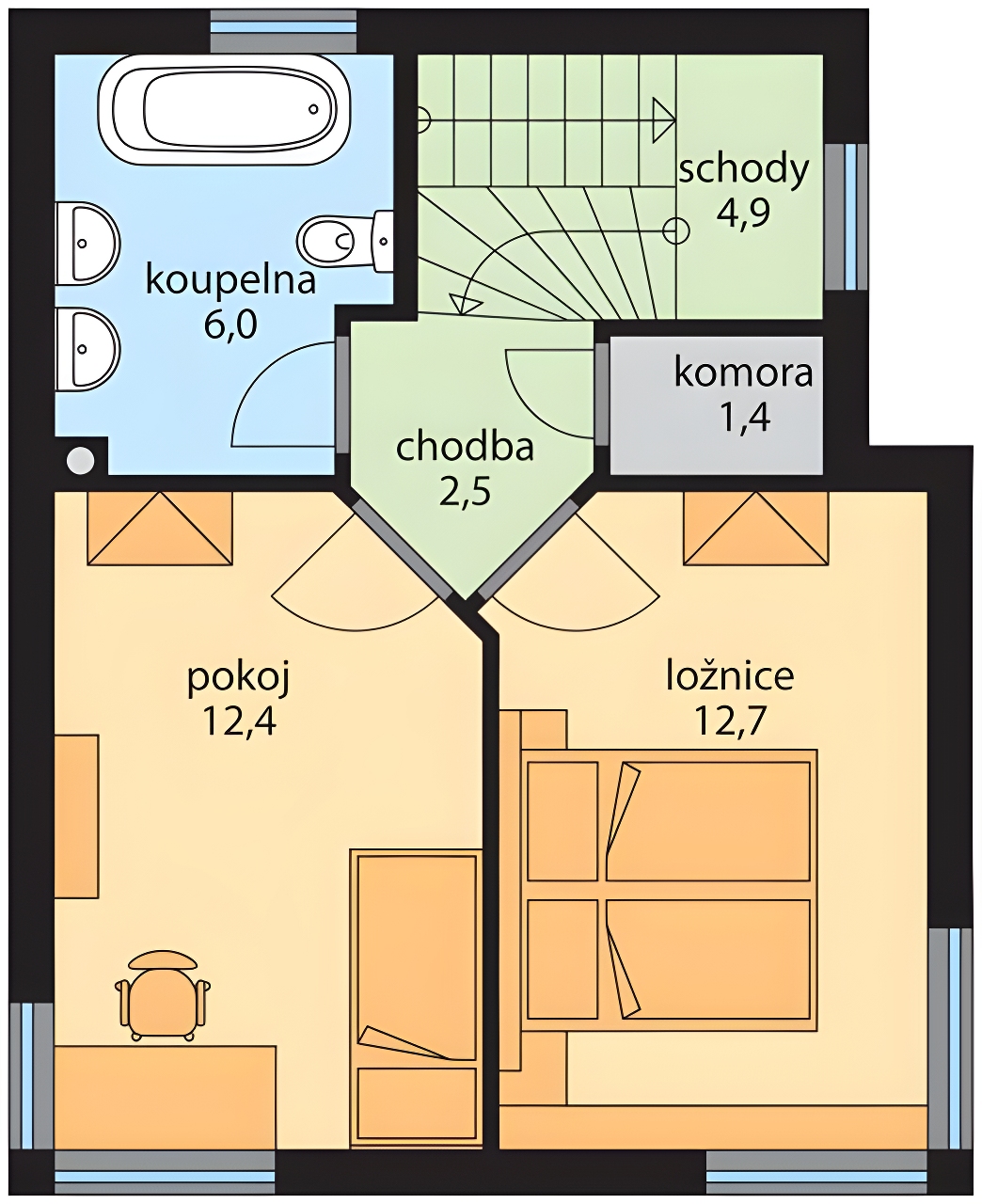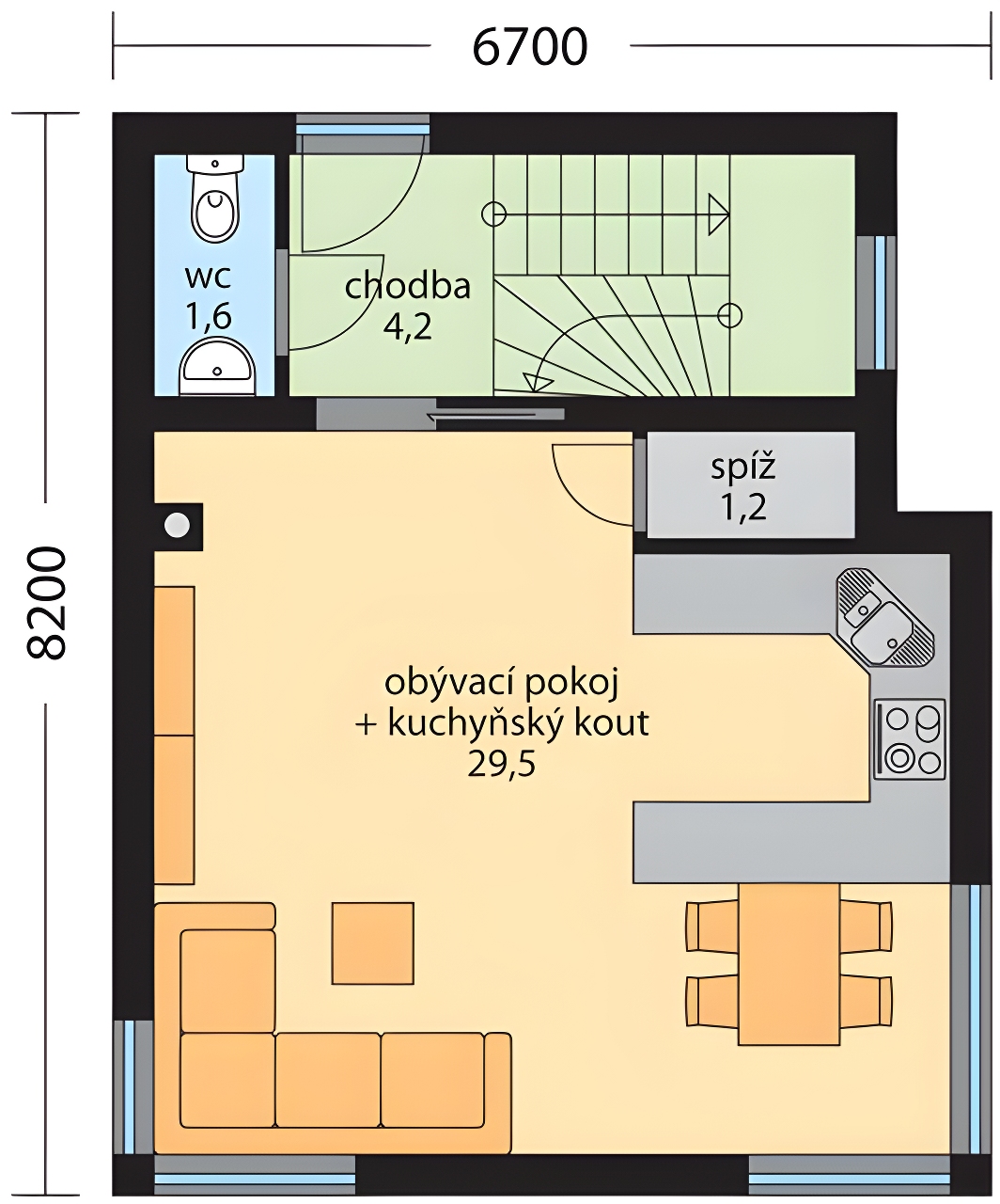 Rodinný dům GALINA je moderní variabilní menší dvoupodlažní rodinný dům s možností přistavění garáže, kterého dispozice umožňuje pohodlné bydlení jedné rodiny. Přes kryté závětří se vstoupí do chodby, ze které je vpravo WC a přímo se vstoupí do obývacího pokoje propojeného s kuchyňským koutem s malou spíží. Z obývacího pokoje je vstup na terasu. Dům má komín, v obývacím pokoji lze vystavět krb, nebo instalovat krbová kamna. 2.NP je přístupné schodištěm z chodby a nachází se v něm klidová část domu - ložnice a pokoj, dále komora, koupelna s vanou, 2 umyvadly a WC. Fasáda je řešena kombinací omítky a dřevěného obkladu. Dle požadavku investora lze navrhnout pouze omítku.