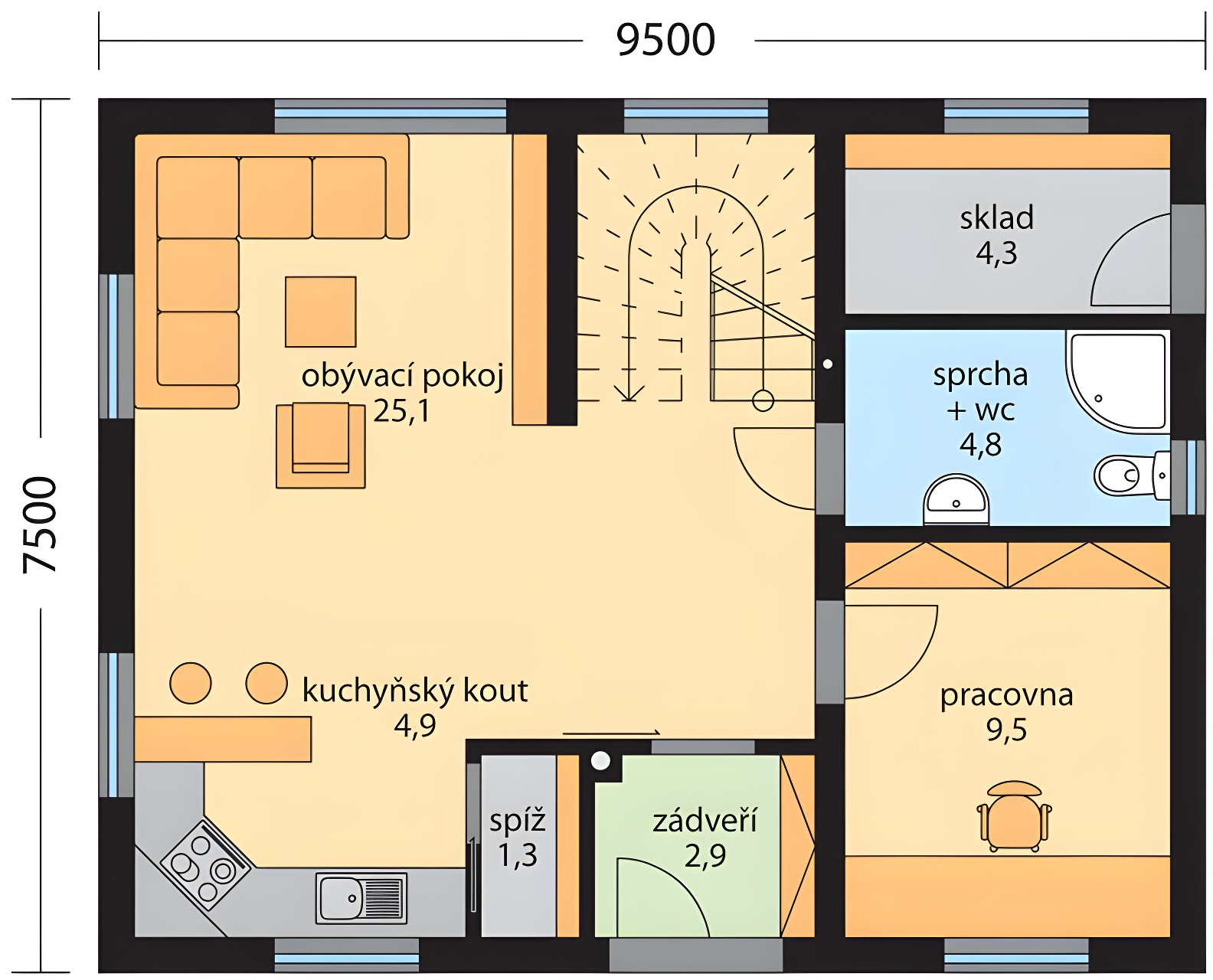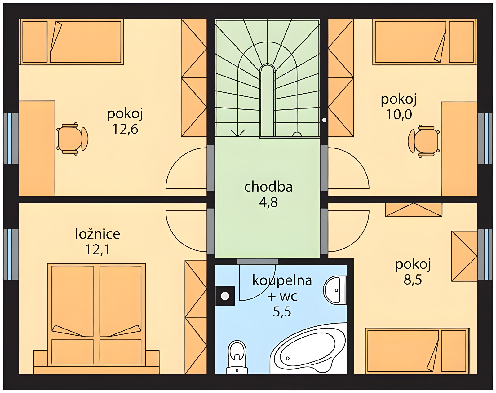 Rodinný dům Jarka je menší přízemní dům s obytným podkrovím, který v šesti obytných místnostech umožní pohodlné bydlení vícečlenné rodině. V přízemí se nachází obývací pokoj s kuchyňským koutem a pracovna, která může sloužit jako víceúčelový pokoj, např. pro hosty nebo místnost na domácí práce. V podkroví se nachází dva pokoje, ložnice a hobby místnost. Typově vhodný do rovinného i svažitého terénu. Nabízíme i v provedení dřevostvba - viz rodinný dům JARKA - D.