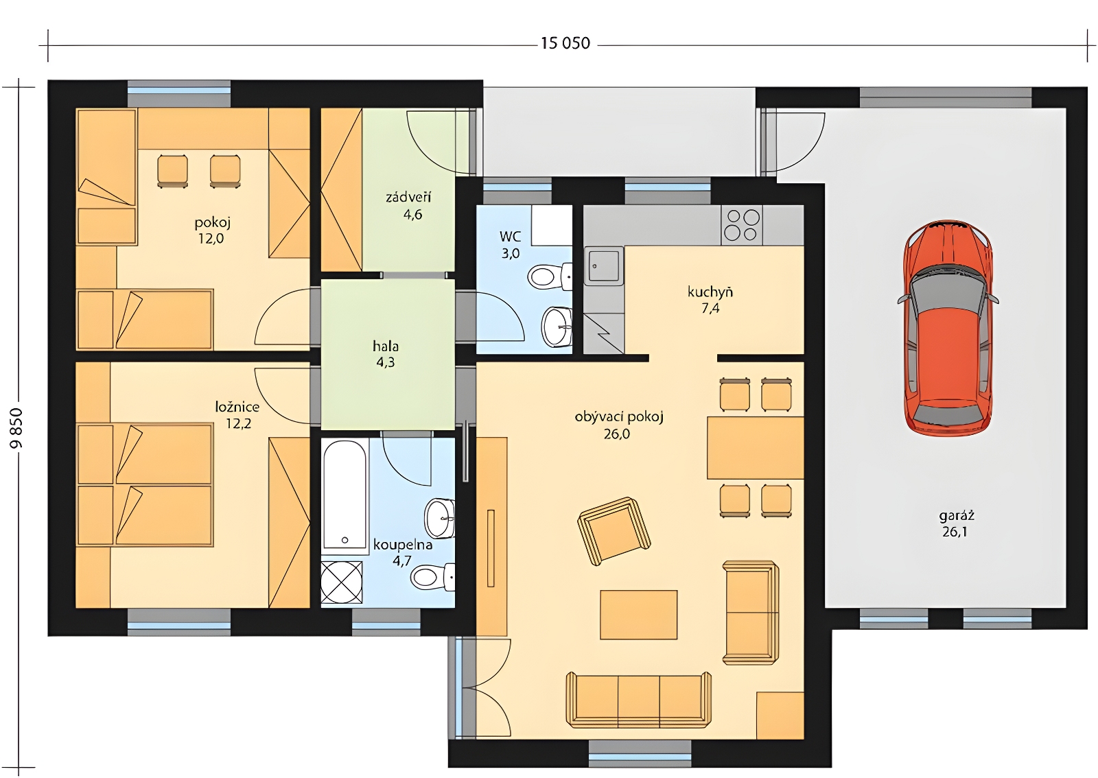 Rodinný dům Jitka je bungalov s garáží, jehož úsporná dispozice zajišťuje pohodlné bydlení i vícečlenné rodině. Krytým závětřím se vstoupí do zádveří a dále do haly, která tvoří hlavní komunikační prostor propojující všechny místnosti /obývací pokoj, ložnici, pokoj dětí, koupelnu a WC/. Kuchyňský kout je součástí obývacího pokoje. Dvoukřídlé balkonové dveře v obývacím pokoji umožňují propojení interiéru s exteriérem, tedy vstup na terasu. Fasáda je řešena klasickou fasádní omítkou s kombinací s dřevěným obkladem, nebo jen ve variantě s omítkou-odstín dle výběru investora.