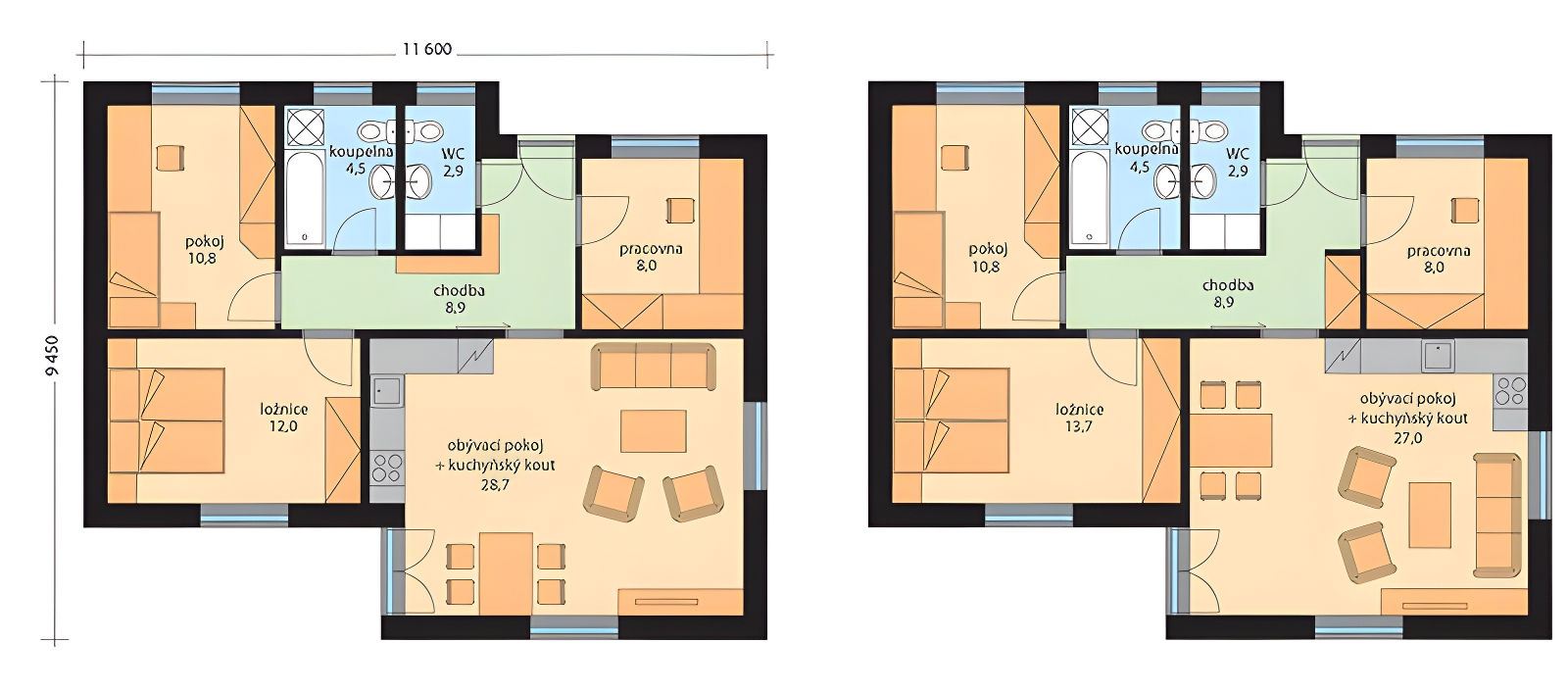 Rodinný dům Jitka je malý přízemní dům, jehož úsporná dispozice zajišťuje pohodlné bydlení i vícečlenné rodině. Krytým závětřím se vstoupí do chodby, propojující všechny místnosti /obývací pokoj, ložnici, pokoj dětí, pracovnu a koupelnu/. Kuchyňský kout je součástí obývacího pokoje. Dvoukřídlé balkonové dveře v obývacím pokoji umožňují nejen propojení interiéru s exteriérem, tedy vstup na terasu. Fasáda je řešena klasickou fasádní omítkou-odstín dle výběru investora. Dispoziční řešení nabízíme ve dvou variantách-dle umístění kuchyňské linky.