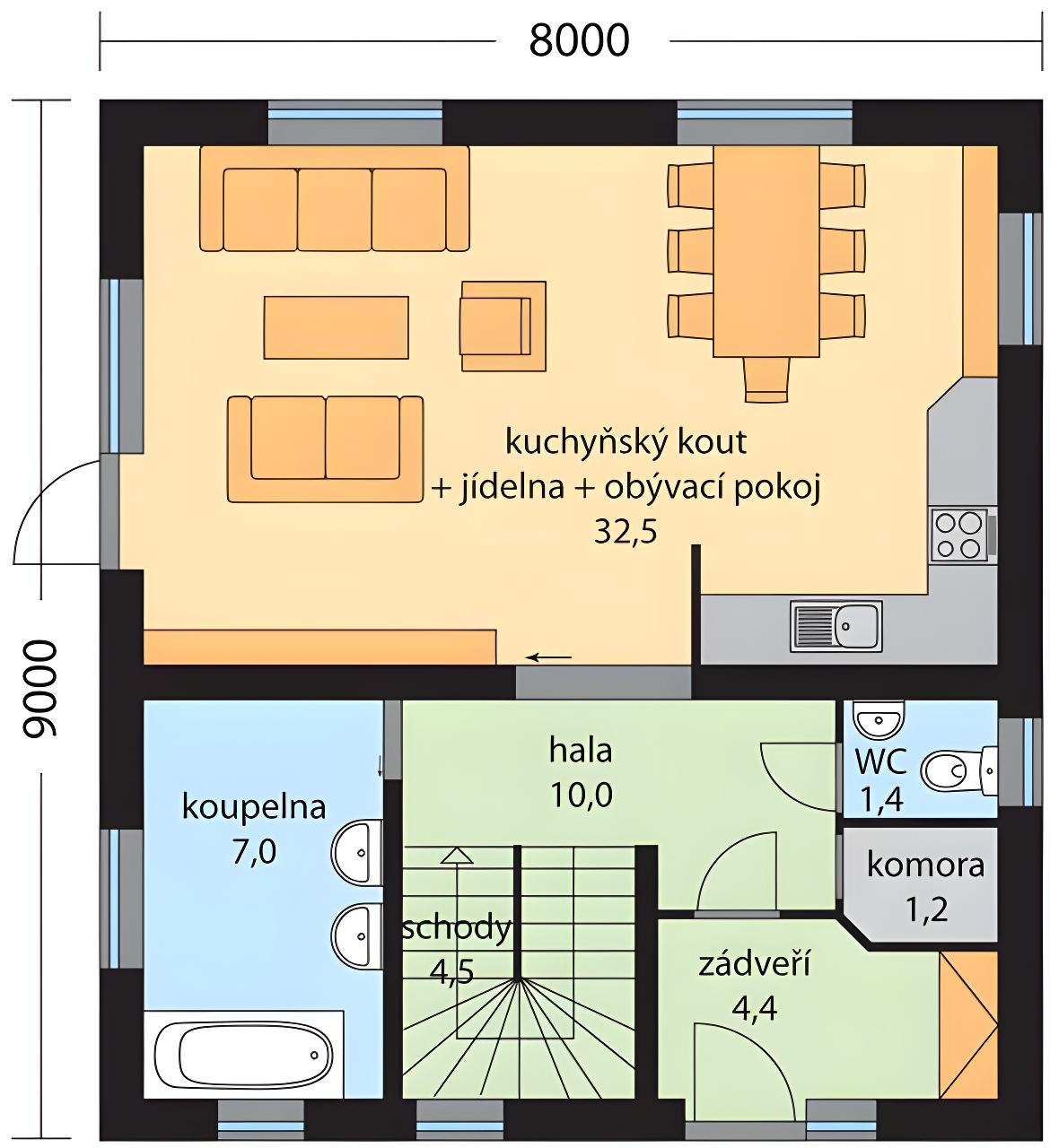 Klaudie je klasický rodinný dům s plně využitým podkrovím, určený pro bydlení jedné rodiny. V přízemí se nachází obývací pokoj propojený s jídelnou a kuchyňským koutem, ze kterého je přístup na venkovní terasu. V podkroví je ložnice, dva dětské pokoje a prostorná šatna.