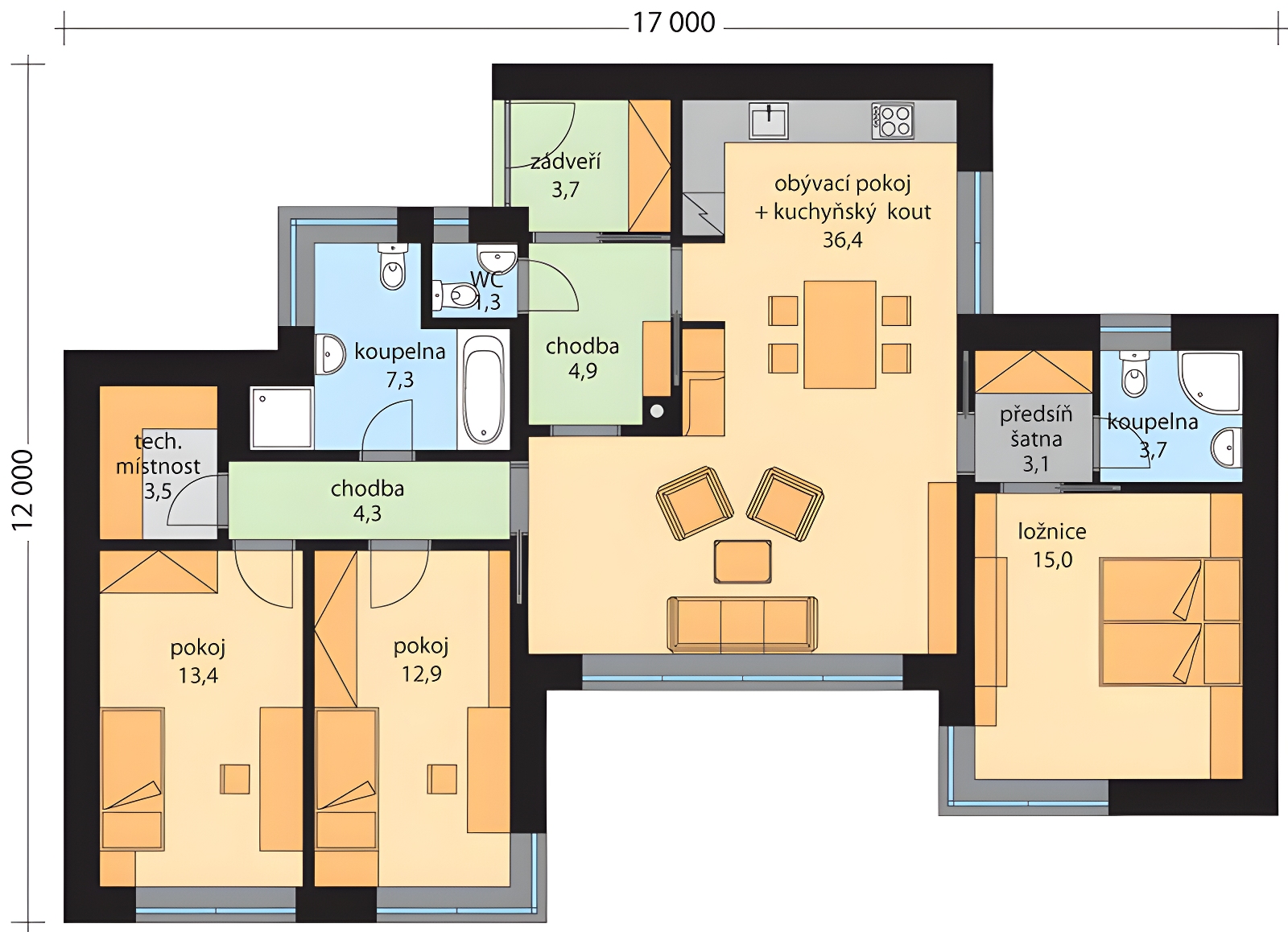Rodinný dům KORNEL je prostorný bungalov umožňující bydlení jedné rodině, který je vhodný na rozlehlejší pozemek. Dům tvoří tři na sebe navazující obdélníky. V levé části domu – klidové, jsou 2 pokoje dětí s přilehlou koupelnou s toaletou. Prostřední část je vstupní a denní, s kuchyňským koutem a obývacím pokojem a v pravé části domu se nachází ložnice s vlastní šatnou a koupelnou. Prosklené francouzské dveře v obytných místnostech umožňují přímé propojení interiéru s exteriérem. Dispozice nabízí nadstandardně nejen dvě koupelny, ale i technickou místnost.