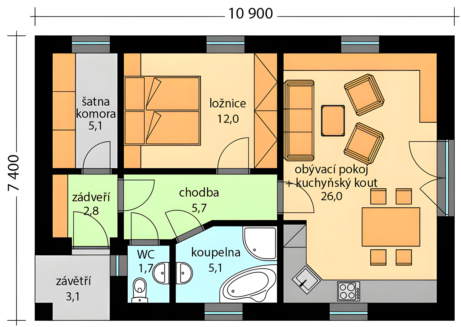 Rodinný dům LEA je ideální pro dva obyvatele. Úsporná dispozice zajišťuje maximální využití půdorysné plochy. Vstoupíme zádveřím, vpravo následuje chodba, ze které se vstupuje do koupelny na WC a do obývacího pokoje, jehož součástí je kuchyňský kout. Dostatek úložného prostoru zajišťuje šatna, která může sloužit i jako technická místnost. Přímo z obývacího pokoje je vstup na terasu. V obývacím pokoji lze postavit komín a instalovat krbová kamna.