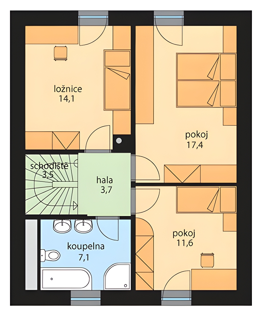 Rodinný dům Marta je menší domek s plně využitým podkrovím, určený pro bydlení jedné rodiny. Dispozičně je dům rozdělený na denní část s obývacím pokojem a pracovnou v přízemí a noční část v podkroví. Obývací pokoj s jídelním koutem vytvářejí jeden prostor s výstupem na terasu. Kuchyň je řešena odděleně. Tepelnou pohodu v obývacím pokoji může zajistit krb, nebo krbová kamna. Po schodišti se z chodby dostaneme do podkroví, které tvoří tři obytné místnosti-ložnice a dva pokoje a koupelna s WC. Technická místnost v přízemí umožní v případě požadavku dovybavit dům technologiemi pro nízkoenergetický standart, nebo může sloužit částečně jako šatna nebo komora. Barevnou kombinaci fasády a její odstíny řešíme dle přání investora.