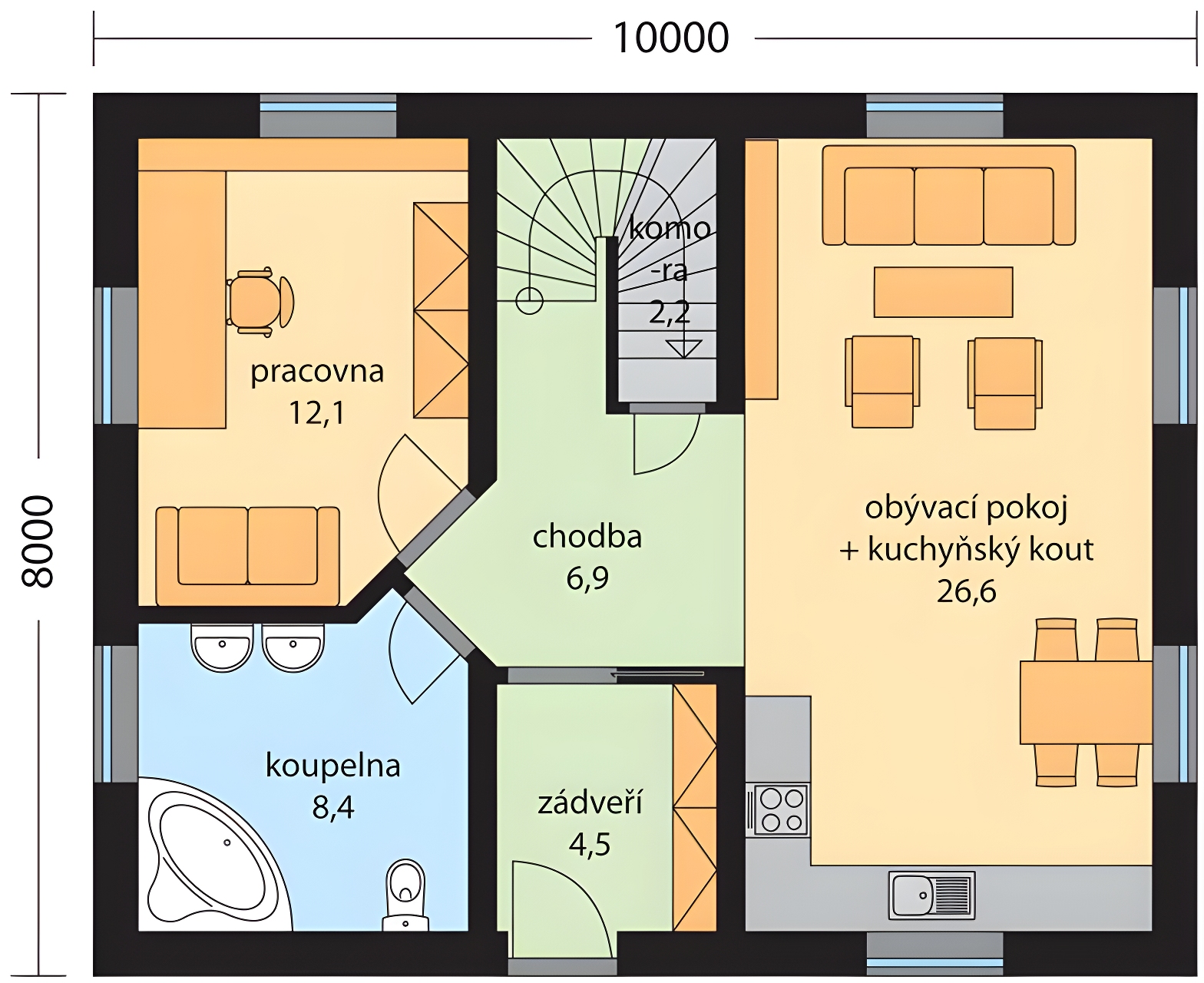 Rodinný dům Matylda je navržený pro bydlení jedné i vícečlenné rodiny. Dispozice nabízí 5 místností s kuchyňským koutem. Dům lze stavět etapově, kdy v přízemí, které zahrnuje kromě obývacího pokoje i prostornou koupelnu se místo pracovny vybuduje ložnice a bude tvořit tak samostatnou bytovou jednotku. Prostor schodiště může dočasně sloužit jako komora. Podkroví, kde jsou navrženy dva pokoje a ložnice, lze dobudovat ve 2.etapě. Sedlová střecha, jednoduchý půdorys a fasáda částečně obložená palubkami – to vše tvoří výraz klasického venkovského domu hodící se do jakékoliv zástavby.