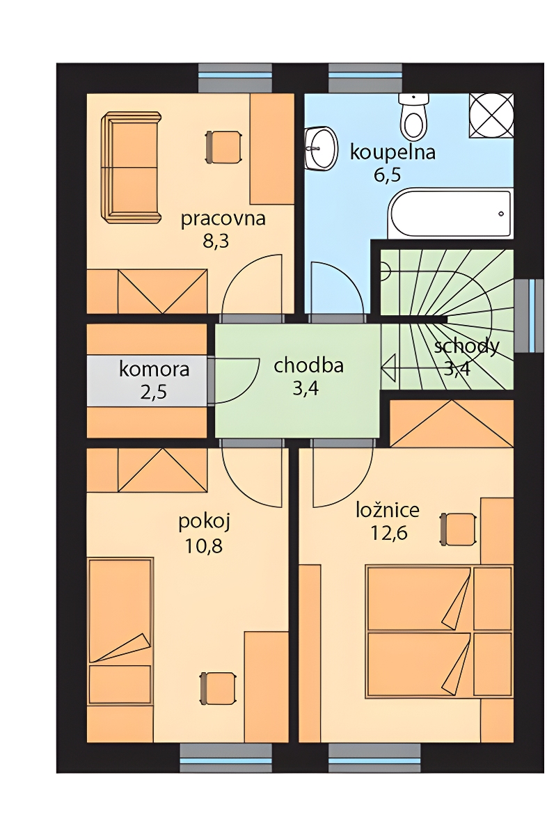 Rodinný dům Merilyn je menší domek s plně využitým podkrovím, určený pro bydlení jedné rodiny. Dispozičně je dům rozdělený na denní část s obývacím pokojem a pokojem v přízemí a noční část v podkroví. Obývací pokoj s kuchyňským koutem vytvářejí jeden prostor s výstupem na terasu. Po schodišti se z chodby dostaneme do podkroví, které tvoří tři obytné místnosti-ložnice a dva pokoje a koupelna s WC. Šatna a komora pod schody jak v přízemí tak a i v podkroví zajistí dostatek úložného prostoru. Barevnou kombinaci fasády a její odstíny řešíme dle přání investora. V případě požadavku lze doprojektovat komín-tepelnou pohodu v obývacím pokoji může zajistit krb, nebo krbová kamna.
