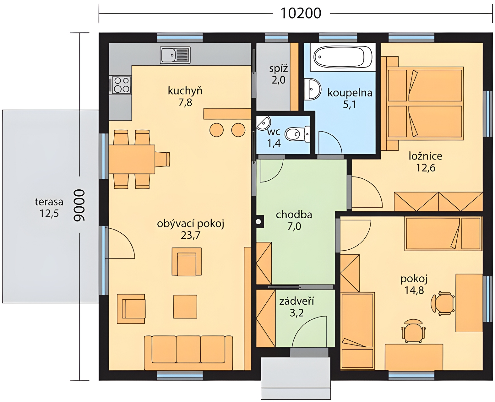 Rodinný dům Míla je samostatně stojící malý bungalov určený pro bydlení jedné rodiny. Do domu se vstupuje zádveřím do chodby, kde vlevo je obytná část domu-obývací pokoj, který je propojený s kuchyňským koutem je opatřen krbovými kamny a jsou zde navrženy balkonové dveře vedoucí na terasu. V pravé klidové části domu jsou navrženy pokoj a ložnice. Z kuchyně je přístupna spíž. Technické zázemí zajišťuje koupelna a samostatné WC. Projekt je nabízen i v nízkoenergetickém standardu provedení. Nabízíme i v provedení dřevostavba - viz. rodinný dům MÍLA D.