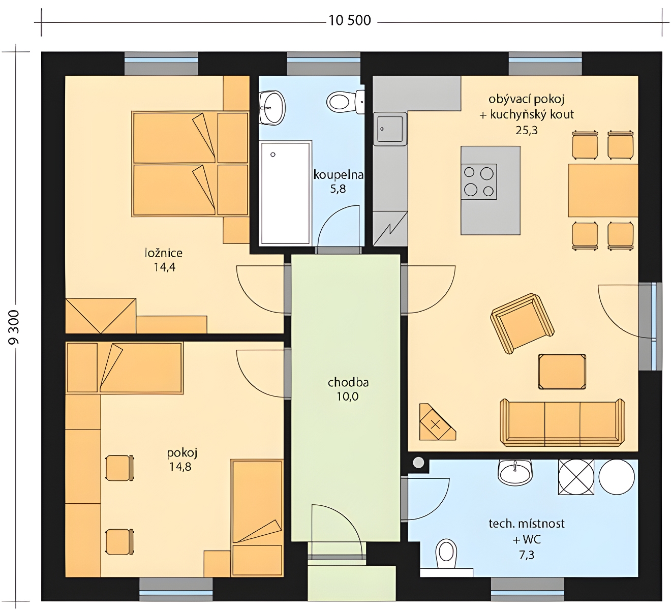 Rodinný dům Miluška je menší přízemní dům, jehož dispozice zajišťuje maximální využití obytné plochy a umožní pohodlné bydlení jedné rodině. Krytým závětřím se vstoupí do chodby, propojující všechny místnosti - obývací pokoj, ložnici, pokoj, koupelnu i WC. Kuchyňský kout je součástí obývacího pokoje, ze kterého se vstupuje na terasu. Prostorné WC s technickou místností lze z části využít i jako komoru ev. šatnu a umožňuje taky dovybavit dům technologiemi pro variantu v nízkoenergetickém standardu. Fasáda je řešena obkladovými cihličkami, lze ji navrhnout pouze ze štukové omítky dle výběru investora.