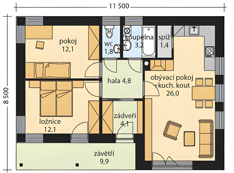 Rodinný dům NIJA je dispozičně jednoduchý dům určený pro bydlení jedné rodiny. Velikostí obytné i užitné plochy patří mezi domy menší velikostní kategorie s jednoduše řešenou sedlovou střechou. Vstup do domu je zádveřím, ze kterého je vstup do haly, ze které se vchází do obývacího pokoje, ložnice, pokoje, koupelny a WC. Obývací pokoj je propojen s kuchyňským koutem. Kryté závětří umožňuje pohodlný vstup do domu, ale i situování části terasy, na kterou se vstupuje z ložnice i z obývacího pokoje.