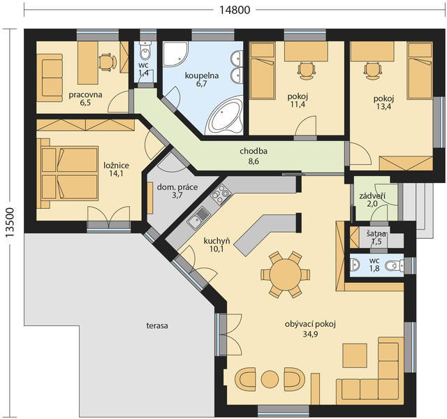 Rodinný dům Petra je zděný bungalov zastřešený valbovou střechou určený pro více člennou rodinu. Přes zádveří se vstupuje do obývacího pokoje a dále chodby, ze které se vstupuje do všech místností-dvou pokojů, pracovny, ložnice, WC, domácí práce a koupelny. V koupelně je sprchovací kout, 2 umyvadla, vana, toaleta. V místnosti – domácí práce je plynový kotel a místo pro pračku. Obývací pokoj je propojený s kuchyní. Z obývacího pokoje, kuchyně a ložnice je prosklenými dvoukřídlými dveřmi vstup na zahradu. Dům je možno zrealizovat s fasádou bez obkladových cihliček, jen s omítkou.