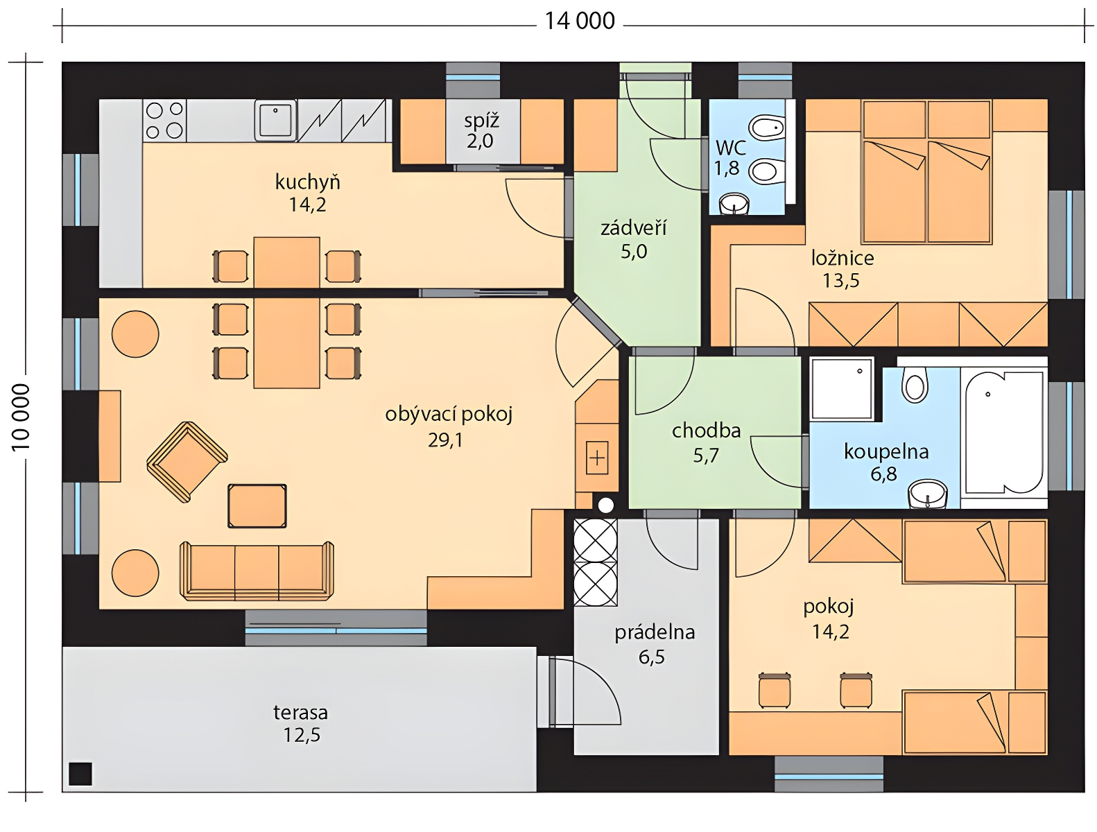 Rodinný dům Rina je bungalov, jehož dispozice zajišťuje maximální využití obytné plochy a umožní pohodlné bydlení jedné rodině. Zádveřím se vstoupí vlevo na wc a vpravo do obývacího pokoje, který je oddělený od kuchyně. Přímo se vstoupí do malé chodby, propojující ložnici, pokoj, koupelnu a prádelnu. Ta může sloužit jako technická místnost, nebo šatna či místnost pro domácí práce. Terasa je částečně zastřešena.