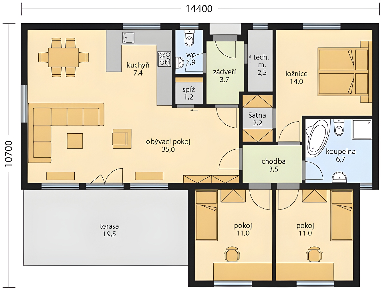 Rodinný dům Rosťa je prostorný bungalov 4+kk určený pro bydlení jedné rodiny. Dominantou prostoru je tradičně obývací pokoj, propojený s kuchyňským a jídelním prostorem. Vstup na zahradu je prosklenými dvoukřídlými dveřmi v obývacím pokoji, které jsou součástí sestavy francouzských oken zajišťujících proslunění prostoru. V levé části domu se nachází koupelna a technické zázemí, ložnice s vlastní šatnou a dva pokoje, které lze sloučit v jeden. V koupelně je vana, sprchový kout, toaleta a umyvadlo.