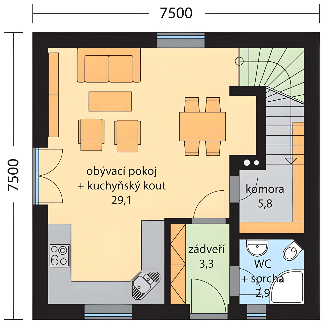 Rodinný dům RUMÍNA je malý přízemní dům s obytným podkrovím s obývacím pokojem a kuchyňským koutem v přízemí a 2 místnostmi v podkroví, určený pro bydlení jedné rodiny. Vstup do domu je zádveřím, ze kterého je přímo vstup do obývacího pokoje a vpravo na WC. Obývací pokoj je propojen s kuchyňským koutem. Z obývacího pokoje je přístup na terasu. Z chodby je přístupné WC a malá komora pod schodištěm. Schodištěm z obývacího pokoje se dostaneme do podkroví, kde se nachází dva pokoje se společným balkónem a koupelna.