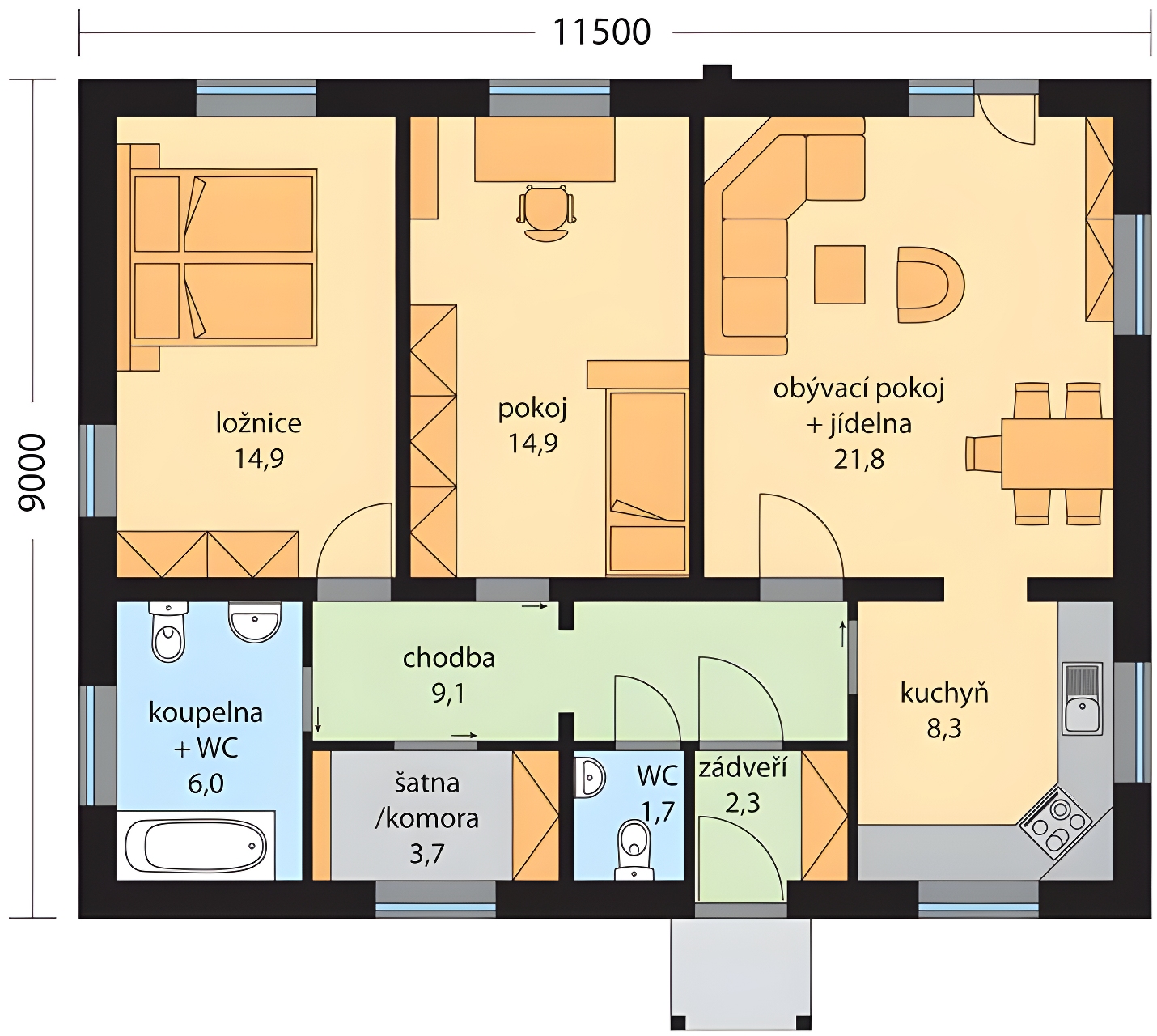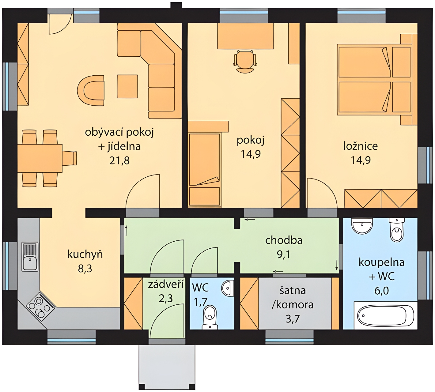 Rodinný dům SAM je menší bungalov se 3 obytnými místnostmi a kuchyní, umožňující pohodlné bydlení jedné rodině. Vstup do domu je zádveřím, za ním následuje chodba, ze které je vstup do všech místností - kuchyně, jídelny a obývacího pokoje, ložnice, pokoje, šatny /komory/, koupelny a WC. Obývací pokoj s jídelním koutem je opatřen krbovými kamny a poskytuje dostatek prostoru pro celou rodinu. Vstup na terasu je z obývacího pokoje.