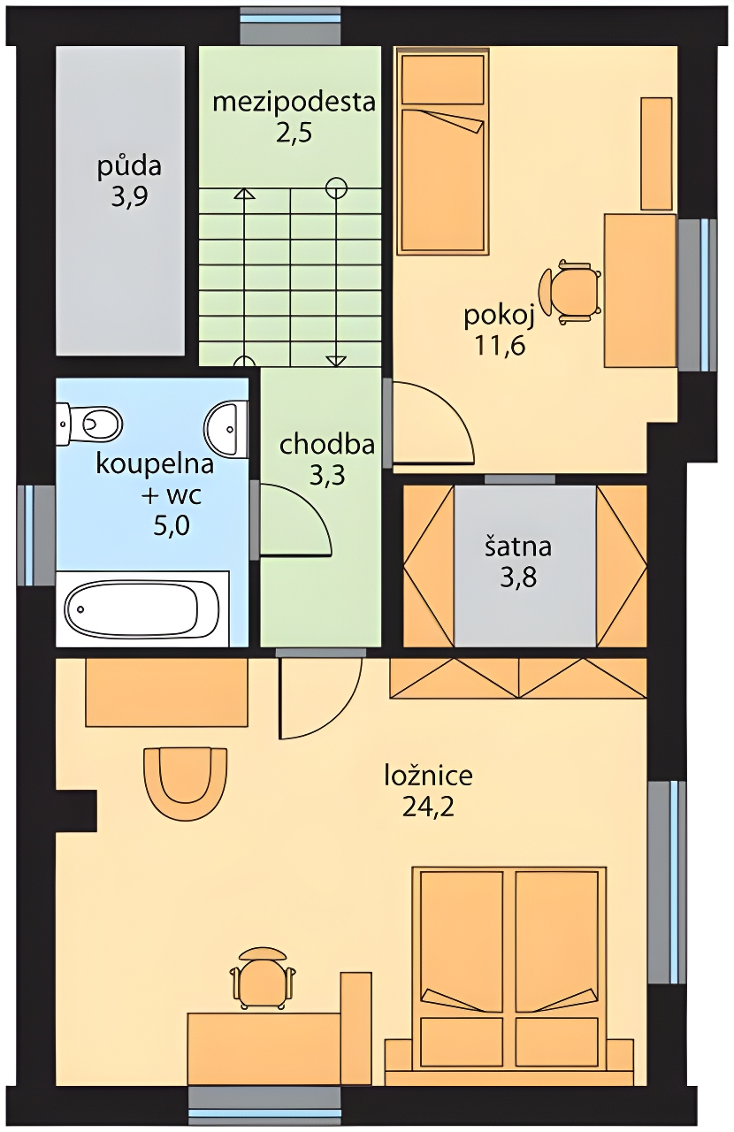 Rodinný dům Šárka moderní dvoupodlažní dům pro jednu rodinu, je vhodný na úzký a svažitější pozemek. V přízemí se nachází obývací pokoj s kuchyňským koutem a pracovna, která může sloužit i jako víceúčelová místnost nebo pokoj pro hosty. V druhém nadzemním podlaží je prostorná ložnice, pokoj se šatnou, koupelna s WC a půda. Z obývacího pokoje i pracovny se vstupuje na terasu. Dům nabízíme i v upravené variantě na rovinatý pozemek a i v pasivním standardu provedení-Šárka-P.