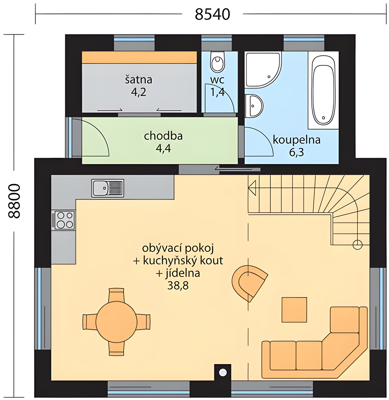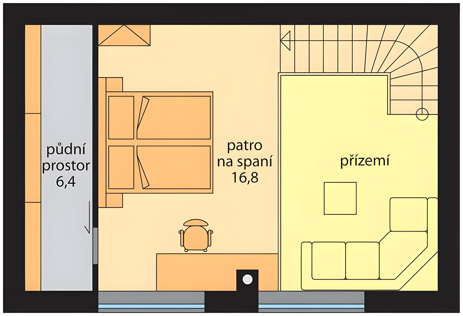 Rodinný dům Sebastian je přízemní dům moderního vzhledu dispozičně řešený pro bydlení 2 osob. Obývací pokoj s kuchyňským koutem je dominantou celého domu. Z obývacího pokoje se vstupuje do zvýšeného patra na spaní se samostatnou malou šatnou, která je v půdním prostoru. Obývací pokoj je osazen francouzskými okny umožňujícími dostatěčné prosvětlení a vstup na terasu. Šatna v přízemí může sloužit i jako komora a nabízí dostatečné úložné prostory.