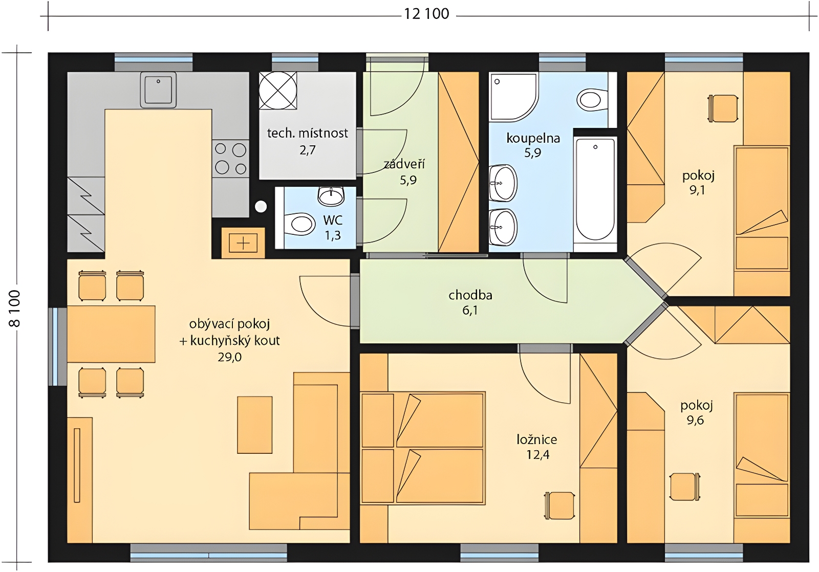 Rodinný dům Selma je malý bungalov dispozičně řešený pro bydlení jedné rodiny. Dispozice má jednoduchý obdélnikový tvar, kde se ze zádveří se vstupuje do chodby, ze které se dál vstupuje do všech místností. Obývací pokoj propojený s kuchyňským koutem je opatřen krbovými kamny a jsou zde navrženy balkonové dveře vedoucí na terasu. Druhá polovina domu je navržena jako klidová a nachází se v ní ložnice a dva pokoje. Fasádu tvoří štuková omítka, barevnou kombinaci navrhneme dle výběru investora.