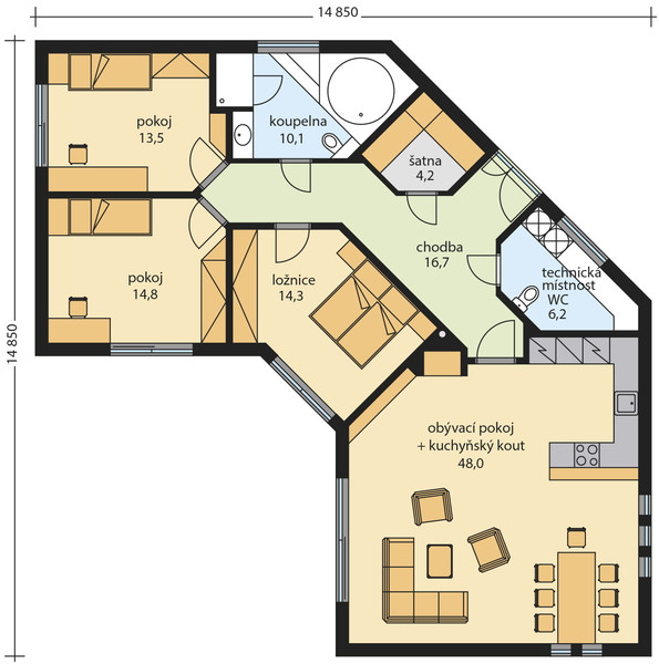 Rodinný dům Stella je bungalov střední velikostní kategorie atypického půdorysného tvaru, který umožní pohodlné bydlení vícečlenné rodině. Vstup do domu je přímo do chodby. Z ní je přímý vstup vlevo do obývacího pokoje, tvořícího s jídelním a kuchyňským koutem jeden obytný prostor a do technické místnosti. Pravá polovina domu je klidová, kde se vstupuje do ložnice, dvou pokojů a prostorné koupelny. V koupelně je toaleta, vana, sprchový kout, umyvadlo. Další toaleta se nachází v technické místnosti, která umožní dům dovybavit i technologiemi pro nízkoenergetický standard. Dostatek úložného prostoru nabízí šatna na protilehlé straně. Ze všech obytných místností je přístupná terasa. Fasáda může být řešena místo obkladových cihliček jen štukovou omítkou dle výběru investora.