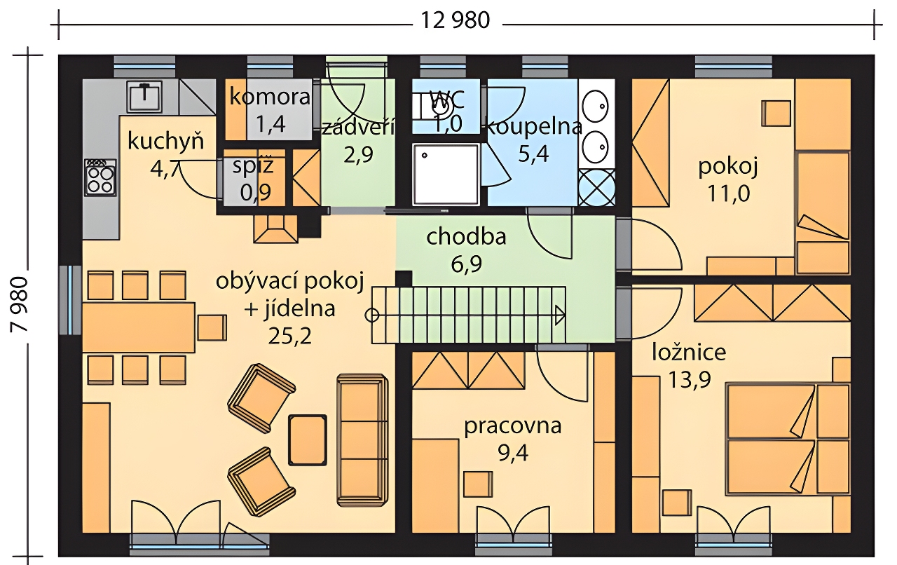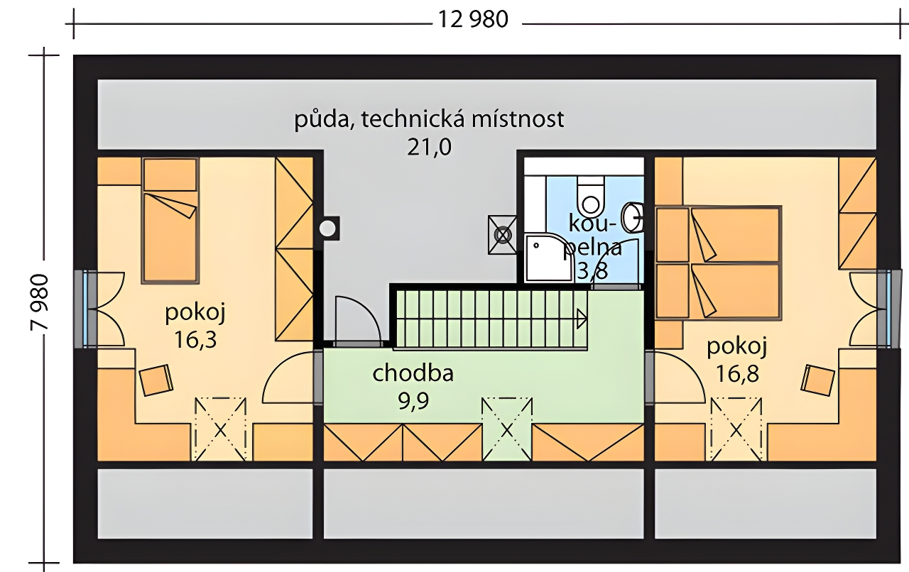 Rodinný dům TERI představuje přízemní zděný dům s obytným podkrovím tradičního vzhledu, zastřešeného sedlovou, jehož dispozice umožní bydlení i více členné rodině. Ze zádveří je vstup do obývacího pokoje s kuchyňským koutem a chodby, ze které vedou samostatné vstupy do koupelny se sprchovým koutem, dvou pokojů – ložnic, umožňující umístění dvou lůžek a pracovny. Součástí kuchyňského koutu je i spíž. Vstup na zahradu je prosklenými dvoukřídlými dveřmi v obývacím pokoji, pracovně i v ložnici. Dispozice podkroví nabízí další dvě ložnice, koupelnu a půdu technickou místnost, která umožňuje tento dům vybavit technologiemi i pro mimořádně úsporný standard.
