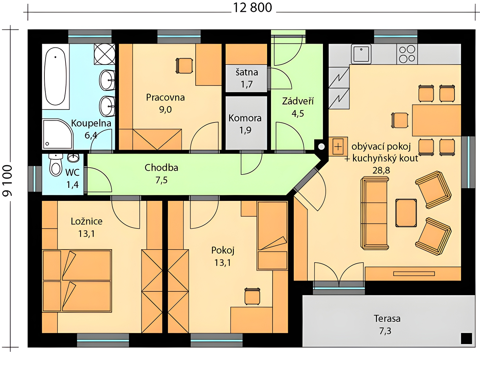 Rodinný dům Tomáš 2 je bungalov se 4 obytnými místnostmi a kuchyní pro bydlení jedné rodiny. Vstup do domu je zádveřím, za ním následuje chodba, ze které je vstup do všech místností - obývacího pokoje, ložnice, pokoje, pracovny, koupelny a WC. Z obývacího pokoje je vstup na terasu, která je částečně zastřešena. Dům má komín-v obývacím pokoji lze pro tepelnou pohodu instalovat krbová kamna.
