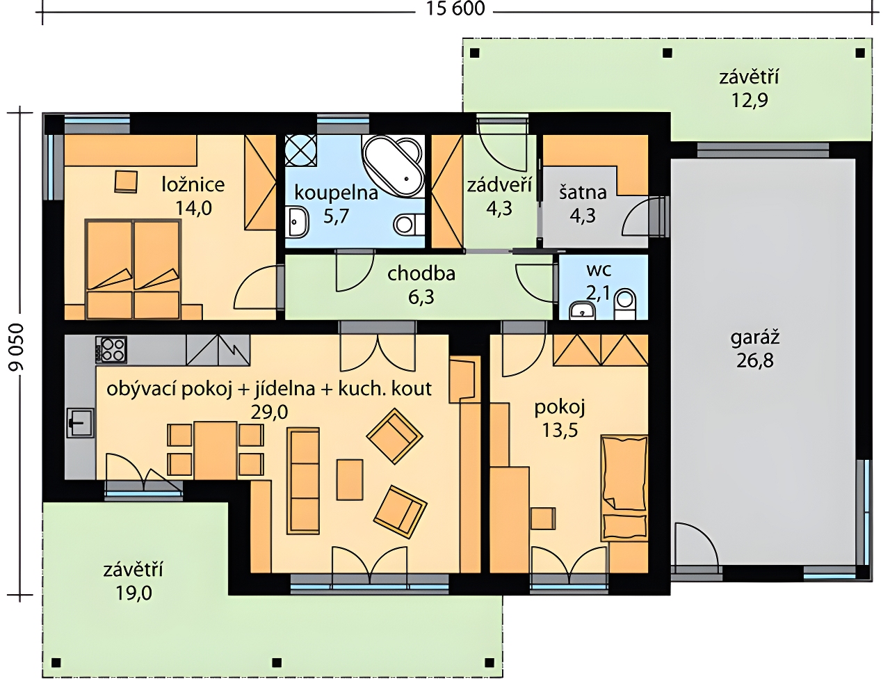 Rodinný dům Viola je přízemní dům s plochou střechou pro bydlení jedné rodiny. Do domu se vstupuje z krytého závětří, zádveřím a dále do chodby, spojující obytné místnosti. Ze zádveří je přes šatnu vstup do garáže. Obytnou část domu tvoří obývací pokoj, propojený s kuchyňským koutem, ložnice a pokoj. Z obývacího pokoje, kuchyně i pokoje je vstup na terasu, kde je pro přirozené stínění a vytvoření pohody navržena pergola.Dům má komín, v obávacím pokoji lze vybudovat krb, nebo instalovat krbová kamna. Součásti domu je garáž, projekt můžeme vypracovat i bez garáže. Dům nabízíme i v dvoupodlažní variantě vhodné pro více člennou rodinu viz. RD Vilibald.