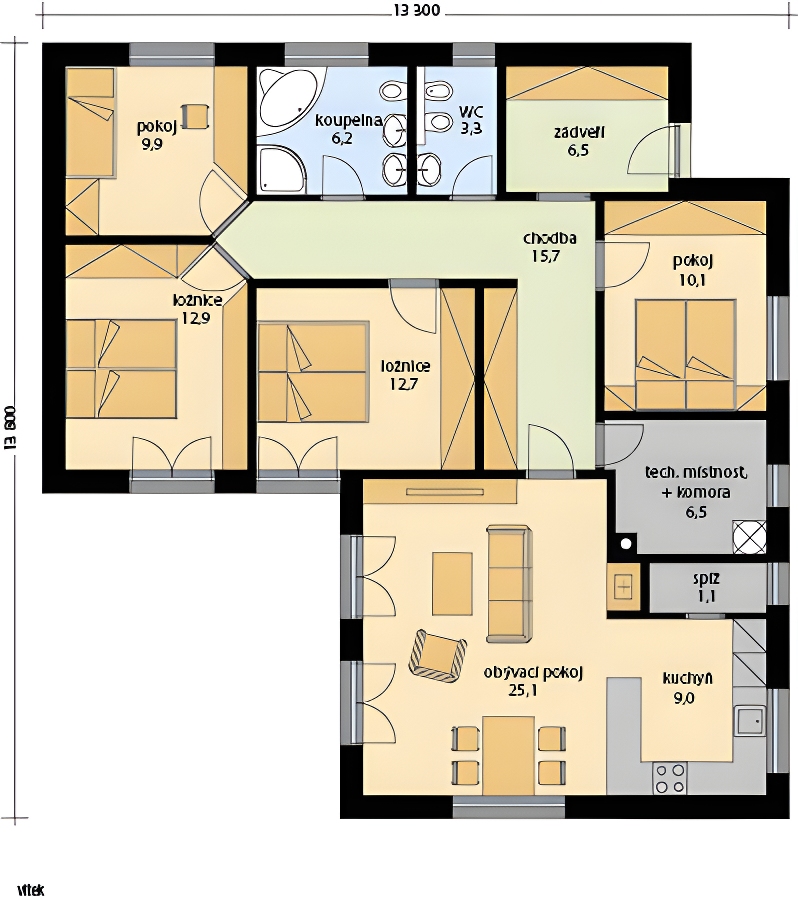 Rodinný dům Vítek je přízemní zajímavě dispozičně řešený bungalov, umožňující pohodlné bydlení vícečlenné rodině. Zvenčí se vstupuje do zádveří a dále do haly, která propojuje všechny pokoje. Štědrou dispozici tvoří obývací pokoj s kuchyňským koutem a malou spíží, dva pokoje, dvě ložnice, koupelna s přilehlým WC. Neméně důležitá je i prostorná technická místnost, která může sloužit z části i jako komora nebo šatna. Navržena je prostorná terasa, na kterou se vstupuje z obývacího pokoje i obou ložnic.