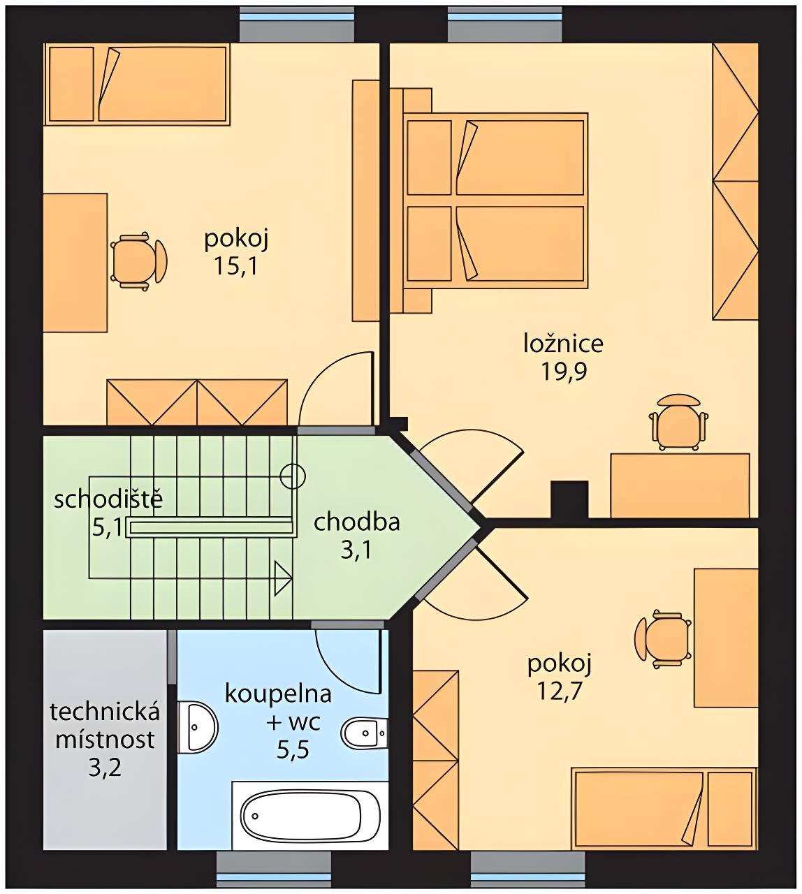 Rodinný dům Walter je menší dvoupodlažní rodinný dům, určený pro bydlení jedné rodiny o pěti pokojích s kuchyňským koutem. Do domu se vstupuje zádveřím se šatnou, dále se v 1.NP se nachází obývací pokoj propojený s kuchyňským koutem a pracovna, která může sloužit jako pokoj pro hosta nebo babičku. V 2.NP jsou dva dětské pokoje a ložnice. Fasáda domu je řešena kombinací fasaádní omítky a obkladových cihliček, možno navrhnout jen śtukovou omítku. Totožnou dispozici s jiným řešením střechy mají RD Salatea a RD Šarlota.