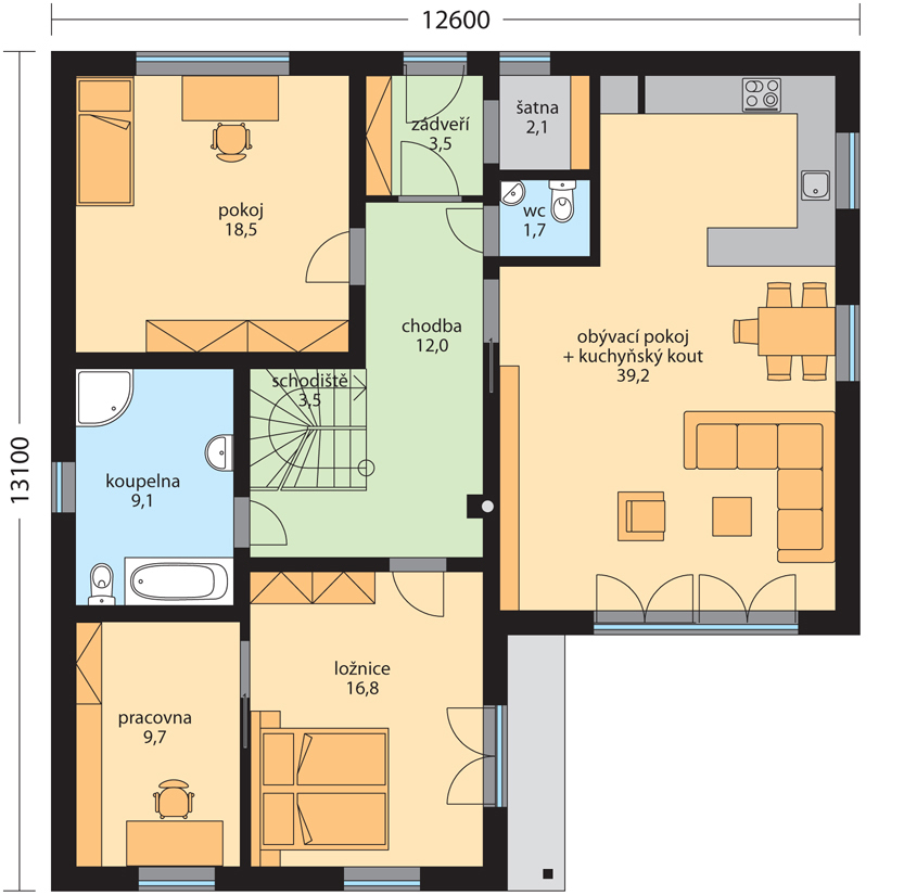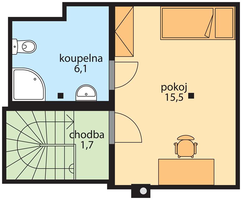 Rodinný dům Afrodita je přízemní dům střední velikostní kategorie s využitým podkrovím půdorysného tvaru písmene L, který umožní pohodlné bydlení jedné rodině. Vstup do domu je přes zádveří, z něhož je přístupná chodba se schodištěm do podkroví. Z haly je přímý vstup do obývacího pokoje, tvořícího s jídelnou a kuchyní jeden obytný prostor, dále ložnice, pokoje a koupelny. Z ložnice se vstupuje do pracovny, kterou lze využít jako pokoj pro hosty, nebo místnost na domácí práce, šatnu... Z obývacího pokoje a ložnice je přístupná terasa. V podkroví je pokoj s koupelnou a toaletou. Projekt vyhotovíme i ve velmi úsporném a mimořádně úsporném standardu provedení, nebo jen v přízemní variantě, kde místo schodiště do podkroví bude komora. Fasáda může být řešena místo obkladových cihliček jen štukovou omítkou dle výběru investora.