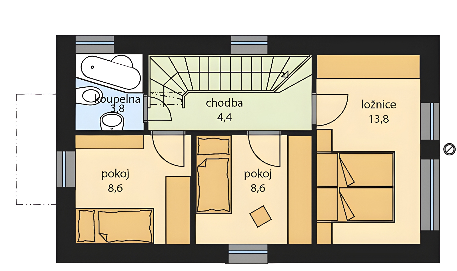Rodinný dům ALENA je moderní menší dvoupodlažní rodinný dům, kterého dispozice umožňuje pohodlné bydlení jedné rodiny a je vhodný i na užší pozemky. Přes zádveří se vstoupí rovnou do obyvývacího pokoje se schodištěm do 2.NP. Obývací pokoj s kuchyňským koutem je opatřen krbovými kamny. Z kuchyňského koutu je přístupná spíž. Francouzská okna ve všech obytných místnostech umožňují nejen propojení interiéru s exteriérem, ale hlavně dostatečné osvětlení. V 2.NP se nachází klidová část domu-ložnice, dva pokoje a koupelna s vanou, umyvadlem a toaletou.